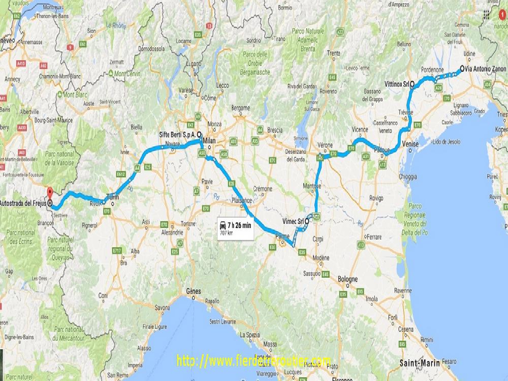 Ce matin, ça rigole plus, je mets mon bonnet et mes moufles pour aller porter mon CMR à la sécurité, le tout évidement environ 20 minutes avant la fin de ma coupure. Je croisais les doigts très fort pour que je puisse avoir mes 9h sans que débarque l'escorte. 8h55, 56, 57, 58, ils se sont mis en place j'avais 8h58, et dans ces cas-là, les 2 minutes qui manquent paraissent très longues, mais j'ai été sauvé par une discussion de dernière minute avac un chef ce qui a eu pour effet d'enerver mes voisins de parking qui eux étaient chauds bouillants, mais moi du coup ça m'a porté à 9h02, OUF respirage. Après 13 minutes de traversée, je fais mes premiers kilomètres en Italie, bien content d'avoir gagné un peu de temps sur ce coup-là. Il y a juste un truc que je comprends pas, et je sais pas si c'est déjà arrivé à ceux qui traversent en escorte, pourquoi on roule jamais à vitesse constante ? Des fois on tombe à 50, 60 ? il y a pas de regulateur de vitesse sur les Trafic ?