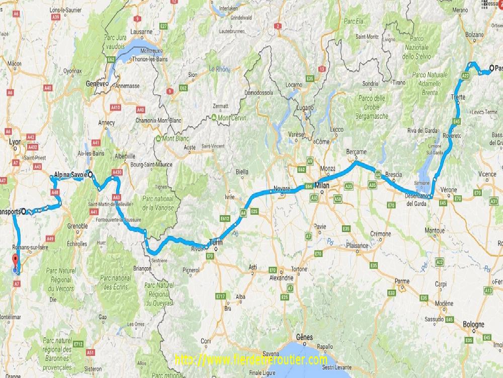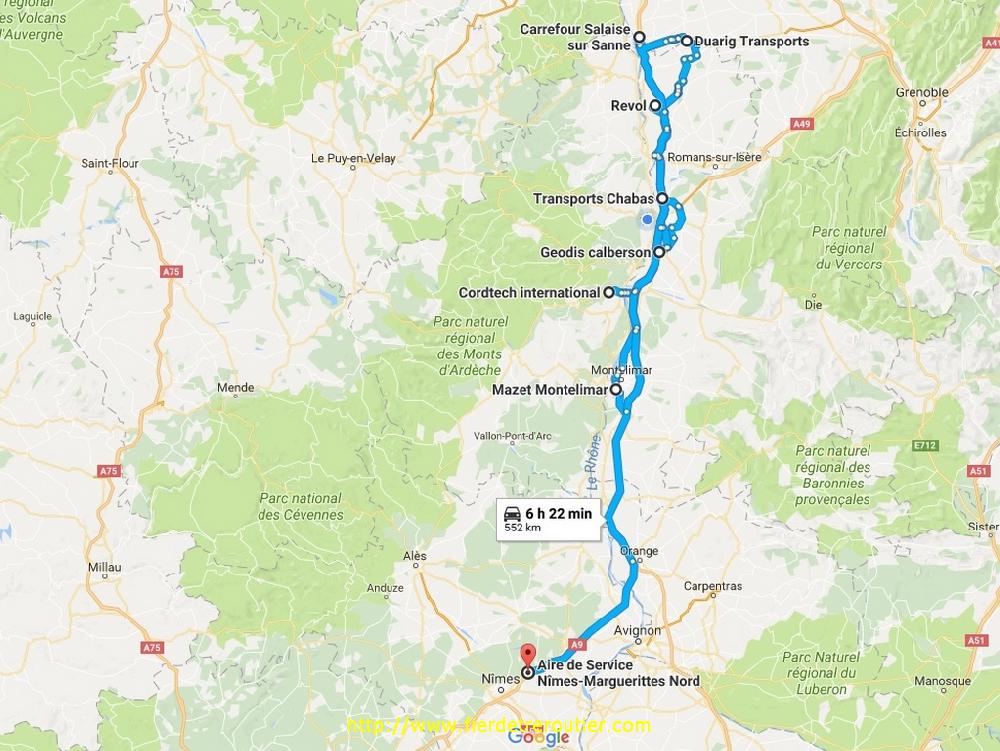 Vu qu'il y a Tour de France dans le quartier et que ça risque de bloquer, j'évite de me jeter sur la N7, je prends par les chemins de chèvres et la vallée de la Galaure de toutes façons c'est pareil et puis ça change. Comme je suis très en retard c'est prêt depuis un moment, les papiers aussi. Le cariste est en pause, j'en fais autant, il charge pendant que je termine mon yaourth "Panier de Yoplait" avec de gros morceaux de cerises. Du coup c'est vraiment barré à St Vallier mais seulement direction Tain, je m'en doutais je remonte à fond les ballons choper l'A7 à Chanas. Sur la descente je dois faire le crochet à St Julien en St Alban, je pourrais dire la banlieue du Pouzin mais ça fait moins exotique. Comme par hasard les palettes font 2m de haut et sont bien lourdes, alors que les palettes de vaiselles font parfois moins de 40cm. Je suis quitte pour tout bouger et mettre les palettes bien lourdes au tablier, il fait à peine 35° cet après-midi, c'est le temps idéal pour faire ça au transpal à main. J'ai perdu 2kg, c'est cool juste avant les vacances à la plage ! Ensuite sprint jusque chez Mazet vider la vaiselle, et je recharge une poignée de clients pour l'Italie avec 2 dépôts à faire sur Montélimar - RETOUR AU DEPOT -
