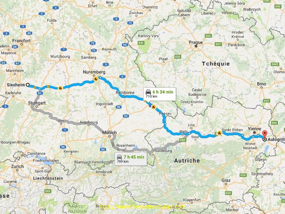 Une heure plus tard quand je repars, Google Map m'indique que le bouchon qu'il y avait juste avant Regensburg, Ratisbone chez nous a disparu, mais un autre le remplace un peu plus loin à cause d'un camion en panne, mais ça passe assez bien si on compare à un bouchon du matin sur la M25. J'arrive assez rapidement à la frontière avec l'Autriche en même temps que le ciel se degage un peu, l'Autriche étant un pays dedié aussi au tourisme, elle ne peut pas de permettre de proposer un ciel de merde à ses clients, alors que franchement, qui va faire du tourisme en Allemagne, à part Juju42 et ceux qui vont à la fête de la Bière ? Je savoure mon plaisir en passant la frontière en voyant mes "pauvres" collègues en train de perdre leur vie pour choper une box. 1km plus loin j'entends le "BIP" qui me dit que tout va bien, la maison Duarig est en train de raquer ! Comme il est midi passé, il est largement temps de m'arrêter au premier parking afin de becter. Dans l'autre sens pour rentrer en Allemagne, il y avait un enorme bouchon, la police a installé un camp provisoire de contrôle technique, ça rigolait pas.