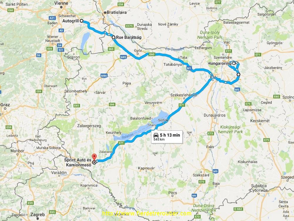 Il ne m'avait pas menti, j'ai effetivement attendu un peu plus d'une heure trente. SUPER ! Du coup j'ai plus qu'à galoper direct sur Budapest. Ici je crois bien que c'est interdit de doubler sur les autoroutes et en plus les gendarmes sont parqués en masse sur les ponts, les sorties de parking, de partout j'ai rarement vu autant de flics en si peu de temps, du coup quand je double je fais pas le malin. La M1 est vraiment destroy par endroits et il y a un trafic plus que soutenu. Pour me mettre un peu plus la pression, le team F1 que je dois livrer m'a déjà téléphoné, ils attendent après moi. J'y suis pour rien moi si je suis en retard. J'ai à peine le loisir d'apprecier le paysage, la seule fois ou je suis passé là, il faisait nuit, et c'est comment dire assez peu indutriel. A un moment j'aperçois un batiment PROLOGIS, c'est le signe que je suis dans la banlieue de Budapest. Pour aller au circuit, c'est pas compliqué il faut suivre UA, via le M0, l'équivalent de l'A104/M25/A52/A46 et le GRA. Les flics sont tellement de partout que je prends aucun risque, ils regardent les plaques, et partent à fond de balle jusqu'au camion suivant, je me demande s'isl arrivent pas à voir à distance si on est OK poue la vignette. Je finis par me radiner un peu avant 12h30 au circuit, la palette de la F1 est enterrée au milieu du voyage, je m'étais pas méfié c'était pas marqué sur ma feuille de recap. Heureusement j'ai juste eu 4 palettes à bouger avant de la trouver. Je fonce ensuite me parquer au GP2/GP3.
