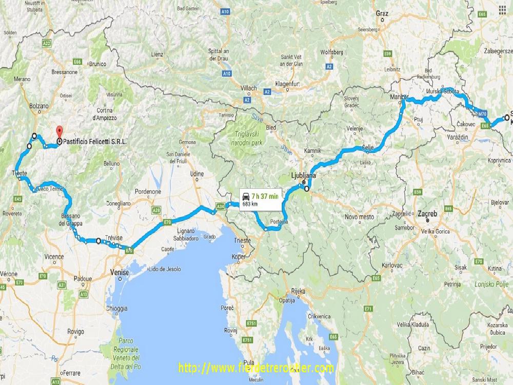 Il est pas question de trainer ce matin, aussitôt que j'ai les 9h de coupure je degage. Il va falloir que ça passe tout bien pour que ça passe tout juste. Aléa Jacta Est comme le disait si bien le militaire Roumain avec des feuilles autour de la tête dont j'ai oublié le nom. 30km de route plus tard, je suis à la frontière Slovène, étant donné que je ne suis pas trop sûr de mon coup, je m'arrête à la station à la frontière pour voir s'il faut un badge, une vignette ou que sais-je encore, mais non, carte au péage à l'ancienne, gut gut ! Comment on dit merci en Slovène ? Thank You, ça passe on dirait. J'en profite pour m'avaler un café et acheter des clopes, moins cher qu'en Espagne. La station est remplie de roumains, d'ukrainiens, et de tout, ça parle fort ça se bouscule et ça me saoule, je reste pas plus de 15 minutes comme ça c'est fait, et je fonce. La traversée de la Slovenie est interdite de doubler aux PL pratiquement tout le long et je perds grave du temps. En plus il pleut, y a du monde, impossible de ne pas se faire remarquer alors je reste sage et zen. Presque. Comme je voyais pas trop par ou aller chez le client j'ai appelé directement et ils m'ont dit de ne SURTOUT pas passer par le col de Sanpelligrino mais par le bas, par TRENTO. C'est bien ce que je craignais. Je fais donc du mieux que je peux, et j'essaie de me detendre en me disant que j'ai quand même du fion de faire un voyage comme ça. C'est joli la Slovenie. Le tachy commence à crier au scandale quand je passe côté Italien à Gorizia, et j'échoue en vrac sur un refuge juste avant l'A4 avec 4h26. Il fait chaud ici !