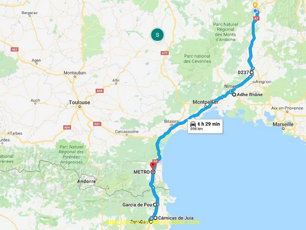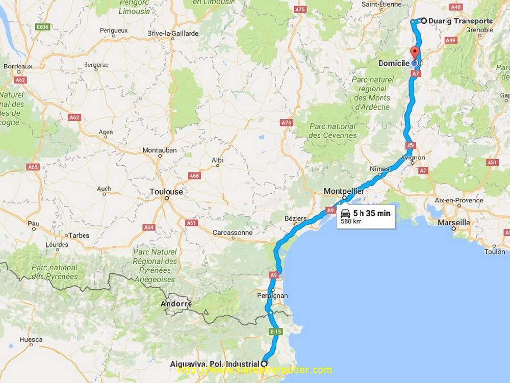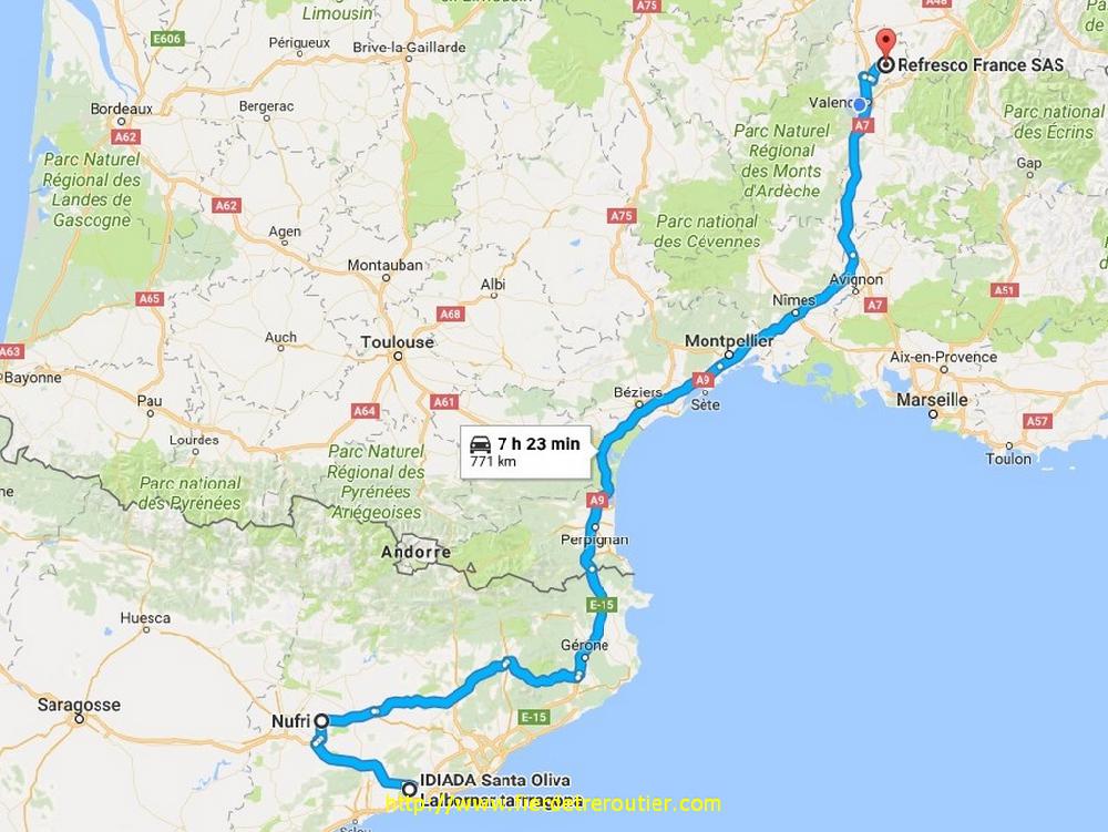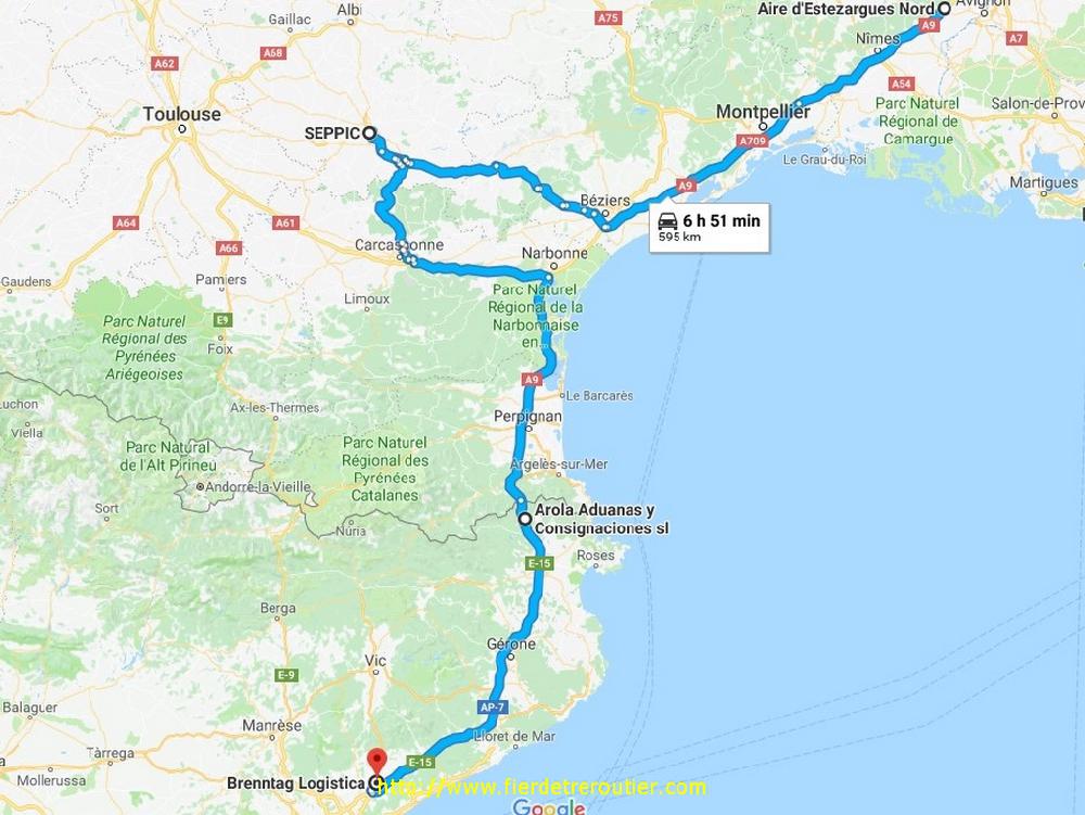 Après Caderousse, je passe le pont qui longe l'A9 ce qui me fait changer de departement et de région, évidement ça roule pas super bien, c'est le Gard. Prochain arrêt Garons, dans la zone aéromachin, je pose 7 palettes ça va vite et retour sur Nimes sans trop trainer, je dois être avant la fermeture à 14h à Ordis juste au dessus de Figueras. Même en ajoutant 30 minutes de coupure, ça me fait arriver à 13h30, IMPEC. Pause gastronomique juste avant Narbonne. Arrivé chez le client à Ordis, le gardien est affolé, ça ferme à 14h, depeche toi. Ohhh y a 6 palettes... Tranquille. C'est un peu ça l'avantage d'arriver pile poil avant la débauche, ça traine jamais. Le seul risque c'est de se faire refuser en fait...