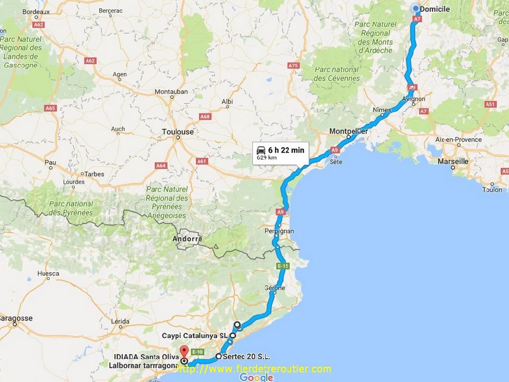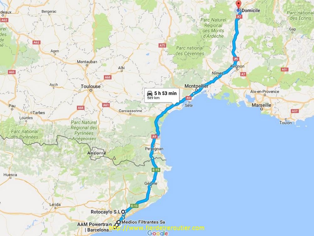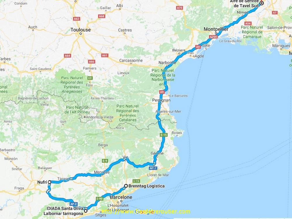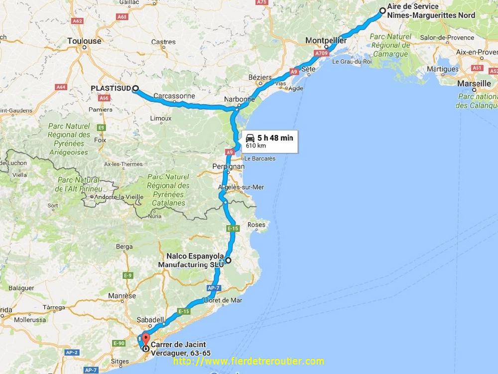 Pour finir ce mercredi, je fais le crochet aussi, 5 minutes à la douane à La Jonquera, et j'ai plus qu'à aller gentiement me garer au plus près de mon client pour demain, je trouve une place à 300m de là, impeccable, le tout en moins de 9h, deux pecables et je valide ma 3e 11, trois pecable. Ah quand ça veut rire !!