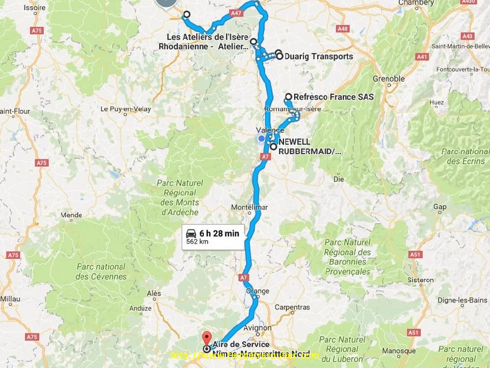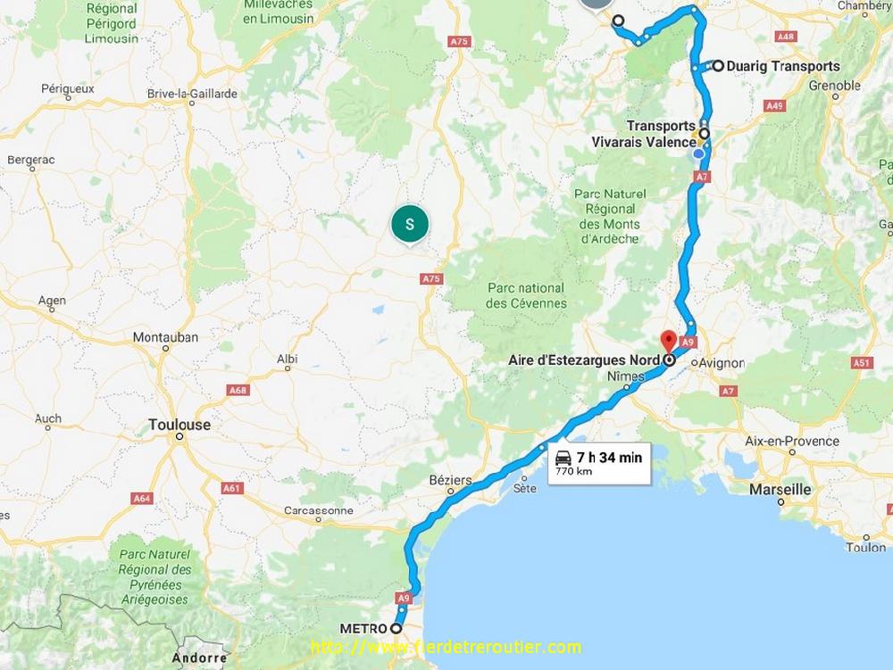 Big suprise, je dois recharger CE SOIR à Andrezieux, il est déjà 17h30, bizarre. Bon, je discute pas, un ordre est un ordre. Vu l'heure je galère grave pour acceder à la plus belle ville du monde après St Peray et Marseille : St Etienne, mais c'est rien à comparer du bordel pour aller à Andrezieux ce soir. Le gardien est au courant, mon numéro est affiché depuis longtemps à l'écran, mais je dois attendre ! Putain, y a personne, et ben, non, faut attendre, ils sont en pause, je dois charger 3 clients en Catalogne dont un à vider demain imperatif en ADR. Donc, je perds presque 1h de ma vie ici, heureusement ça va assez vite pour charger, si bien que je repars à 19h45. Les bouchons ont disparu, je retourne à Jarcieu completer avec 2 palettes. Stephane à encore explosé son amplitude de boulot aujourd'hui, mais je crois bien qu'il s'en fout. J'ai en même temps compris pourquoi ce chargement "urgent", c'est juste un chauffeur roumano-espagnol qui s'est fait refoulé à cause d'un mauvais équipement, donc, en catastrophe DUARIG a trouvé une solution et c'est tombé sur moi, no soucy. Poussé par un fort Mistral encore, je descends au plus bas ce soir en me disant que c'est cuit pour faire avant midi à Castelnaudary. J'échoue en bout de bout de bout d'amplitude à Nimes Margheritte, au calme, IMPEC !