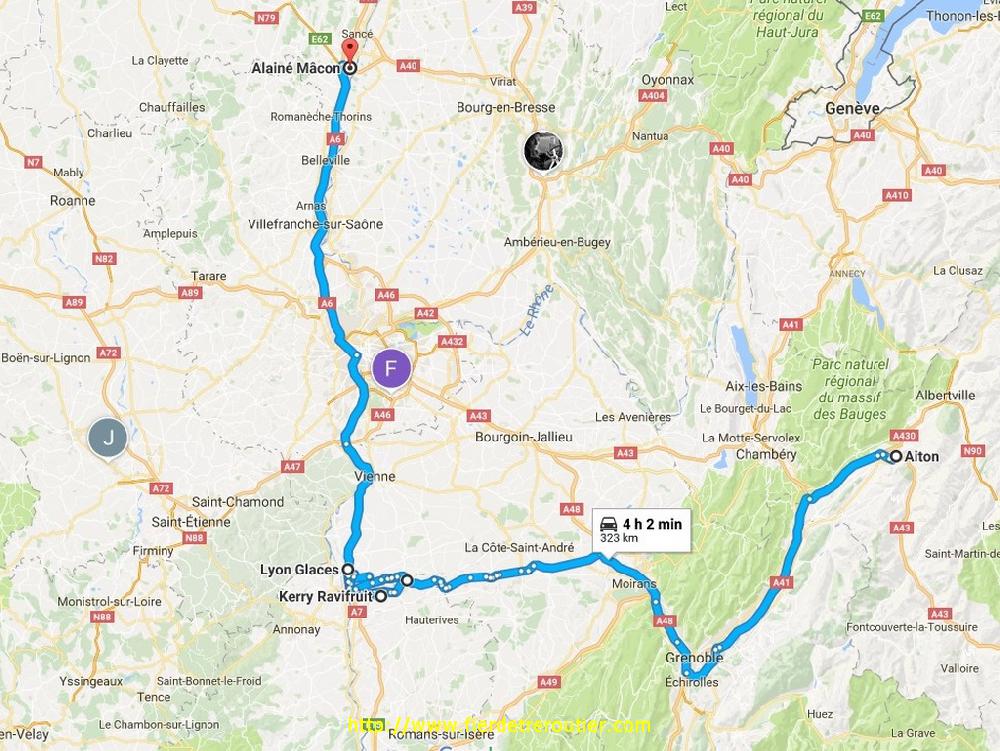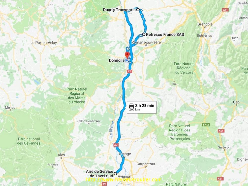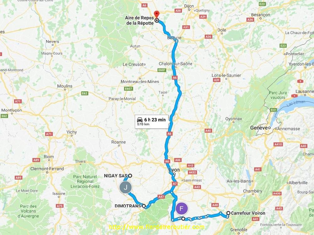 Dans la semi, j'avais de la GB, et de l'Espagne, donc en toute logique une fois tout vidé je mets un lot ADR pour la Belgique devant et je complète avec des boissons fraiches pour Fontaine-Bonneleau. Il peut neiger, j'ai pas peur, je colle à la route. Justement ça tombe bien parce qu'il se met à pleuvoir. Il y a si longtemps qu'il a pas plu que les gens ont la trouille de conduire et font n'importe quoi, ça roule mal de partout. J'ai hésité à attendre un peu avant de repartir ou de monter par Cours et Buis, mais je suis lourd comme une vache. Comme prévu sur Lyon, ça a cartonné dans tous les sens, je pers une grosse demi heure de ma vie sur l'A46. Heureusement après ça va mieux et toujours sous la flotte, la terre en a bien besoin. Je comptais roupiller sur le parking dans le Bessay mais il était fermé, évidement la station en haut était pleine comme Brigitte Fontaine, resultat des courses je me suis radiné au suivant avec 9h09. On vera plus tard si je compte 9 ou 10 msieur l'agent. Ayez pitié.