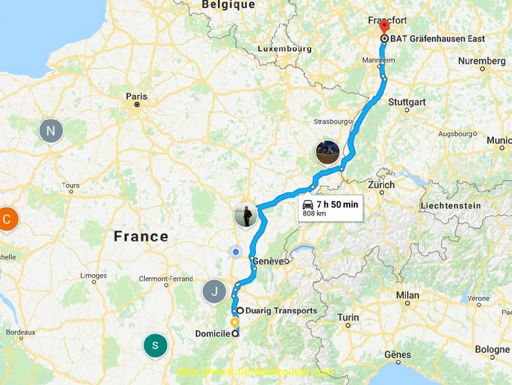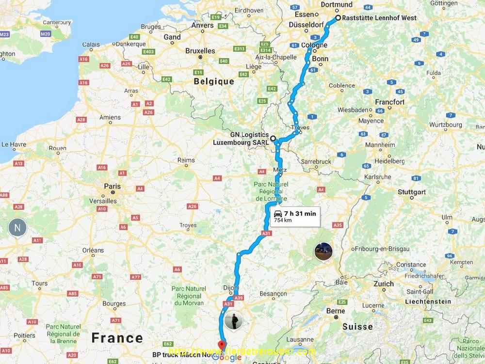 Dans des cas comme ça, la coupure de 45 est bien longuette, j'hésite à faire une micro sieste. Le gros avantage de tout ça, c'est que vu l'heure ça roule nickel pour passer Mulhouse, et encore plus nickel une fois sur l'A5, aucun STAU, je garde le 90 primeur tout le long, ni un fourgon de la Polizei ou de la BAG embusqué, fais tirer garçon ! Je vais donc au plus loin que je peux, vu la place qu'il y a sur les parkings je peux faire le fou, si bien que je me suis posé à 1h44 à Darmstadt juste avant Frankfurt, nickel ! Comme dit le slogan, LE TRANSPORT FRANCAIS : VITE-LOIN-BIEN ! Gut Nacht !