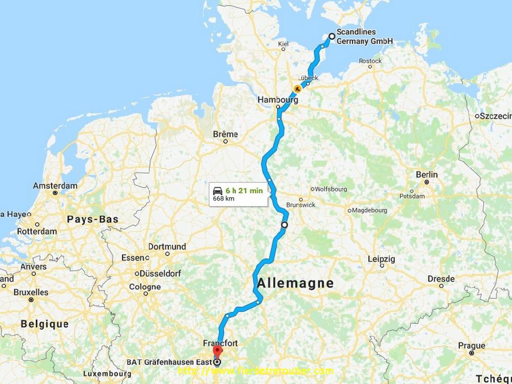 Du coup, j'ai fait ma dernière coupure de 30 minutes juste avant Hannovre. Ensuite, ça a été que du velours pour finir la journée. Passer Hambourg après 20h ça le fait. Je garde un oeil sur les parkings tout le long, il y a de la place malgré l'heure, sauf justement à Hambourg, mais ici c'est assez petit. Une fois passé l'embranchement de Lubecke, il y a vraiment plus personne, OKLM ! Je me pose à 22h30 sur le parking de la Scandline, c'est bien marqué stationnement limité 30 minutes, mais il y en a d'autres qui coupent ici aussi, j'hésite quand même à embarquer mais ma vignette ne commence que demain. Alors bon...