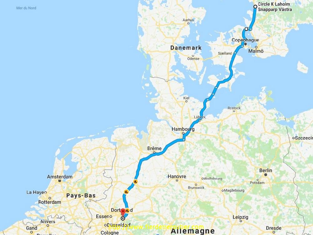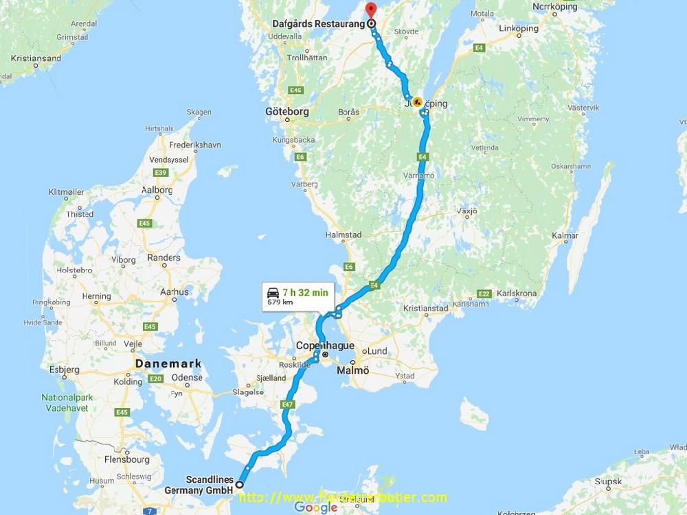 Pendant que je cassais la croute sur un pauvre parking à l'entrée de Copenhague, la Police contrôlait des camions, mais visiblement, je les interessait pas, tant mieux. J'ai pas trainé, et je suis arrivé toujours sous une pluie épaisse à Helsingor pour prendre le ferry pour Helsinborg, avec un bateau toutes les 20 minutes, y a pas de stress, et surtout pas de quoi caser 30 minutes de coupure. Une fois au Suède, recontrôles, il y a deux Carrion qui font les chauds à la sortie du bateau, c'est assez ridicule. Gros coups d'accelerateur, gros coups de frein, gros con.
