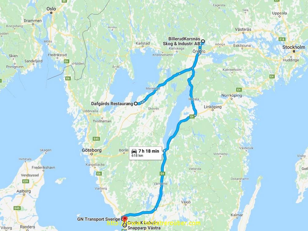 Les commandes sont prêtes, ce qui tombe plutôt bien, je peux donc rentrer et charger, en essayant de ne pas mélanger les lots parce que les étiquettes sont pas très claires, heureusement j'ai mon marqueur et des caristes patients. Par contre j'aurai une palette de moins, parce qu'un cariste en a éclaté une, ça arrive. C'est drôle quand un suédois fait tomber une palette. Chez nous, ça grogne, ça insulte ça accuse le chariot, le sol, là, rien. ça découpe tranquillement le code barre au cutter, un gars va chercher une benne, un autre vient et chacun empoigne des paquets de feuilles pour les jeter, au calme. A 14h30 je repars de BillerudKorsnäs Skog, direction Halmstadt. D'ici il y a 420km, je me suis annoncé pour 21h30, ils attendent les palettes, no stress. A peine ressorti d'Obrero que la nuit tombe il est 15h30. C'est dommage parce que la route qui rejoint Jonkoping par là, doit être vraiment jolie. Mon seul problème, c'est que j'ai pris une bonne radée de neige. Immédiatement, les saleuses sont dehors. Arrivé à Jonkoping, il y a plus rien, c'est le dégel. Je me suis finalement radiné à 21h20 à Halmastadt, le temps de vider recharger doucher, ça à prit pas loin de 2h, et je me pose sur le premier parking au Circle K Laholm Snapparp Västra, il est 23h31.