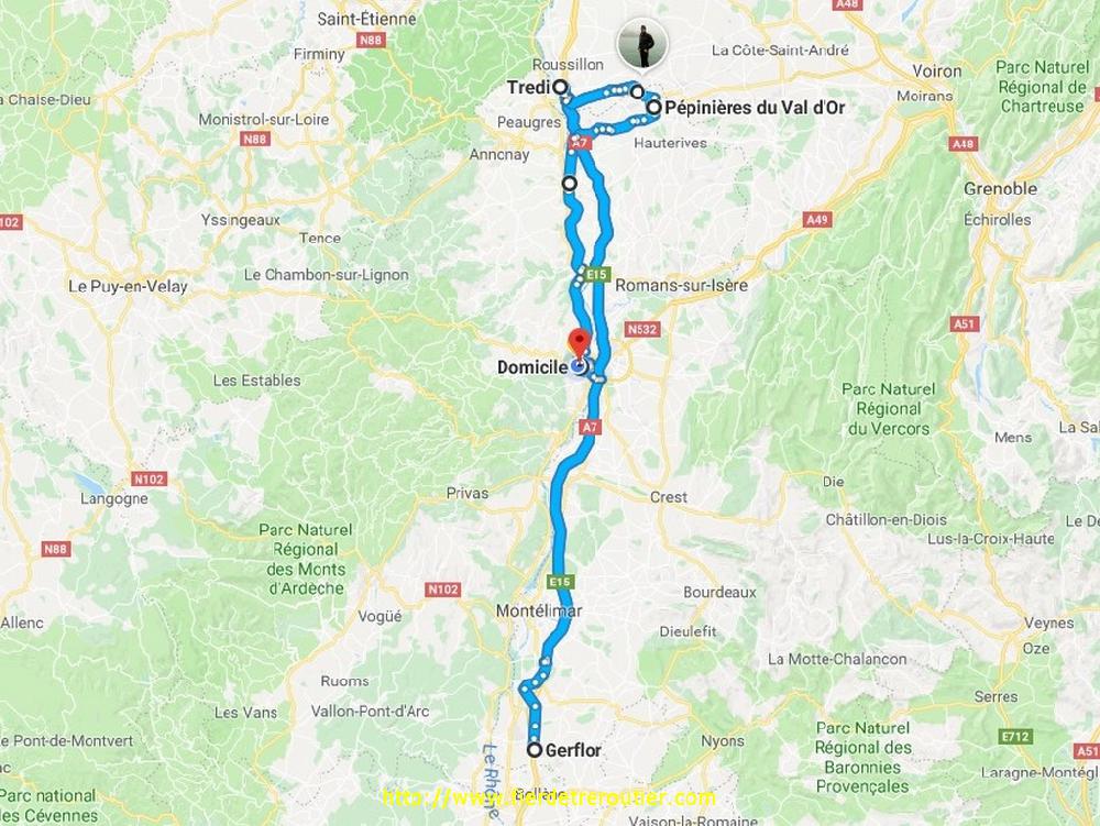 Je remonte bien tranquillement, ben oui, RDV 16h à Salaise, le temps de manger je me radine à 13h30. Contraiment à ce que je pensais, je suis passé tout de suite, il y avait personne. Quand je suis vide, le plancher de me semi est deguelasse, je fantasme sur un recurage complet. Mais voilà, j'ai un rechargement aux pépinières à Lapeyrouse, donc, le recurage on vera plus tard. 11 palettes d'arbustres fruitiers qui finiront par être plantés au Maroc. Le client exige qu'il n'y ait aucune trace de terre sur les racines pour être certain qu'aucun pesticide ne viendra souiller le sol Marocain, donc ça coule à mort dans la remorque, au point ou elle en est... Je rentre tranquille au bercail, à 17h46.