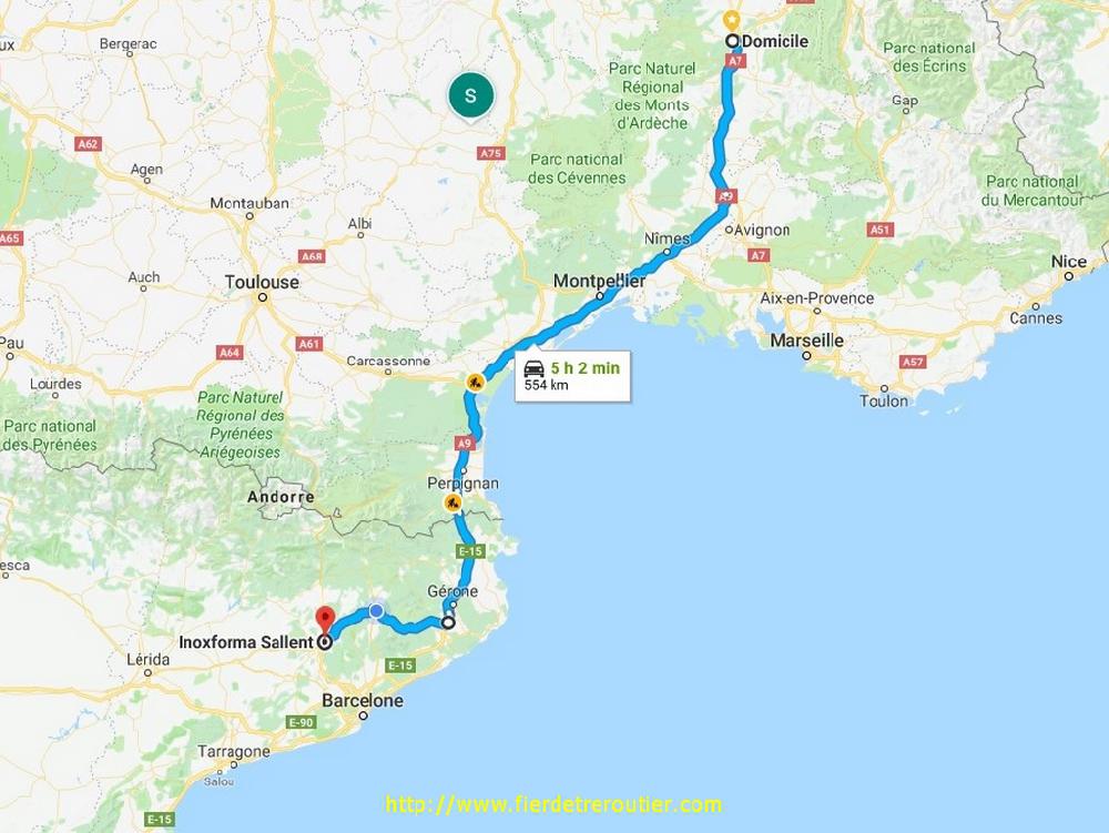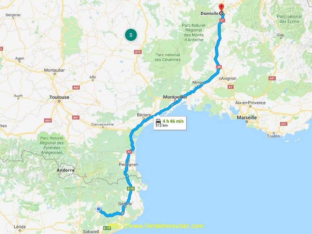 Evidement, bien que je garde tout, je suis chargé à l'envers. Mon chef m'a quand même donné le choix : Normandie ou Catalogne. Des fois je me demande à quoi il pense ! Quel être humain prefererai aller en Normandie, sauf bien sûr s'il est normand ? Donc, aidé par Mister Franck, je refais mon voyage, le temps de faire les pleins, dire une mechanceté à Régis je repars du dépôt un peu avant 16h. J'ai devant moi 4h08 pour rejoindre Narbonne, c'est un peu court, mais j'ai un Volvo. Certes c'est l'hotel des courants d'air, mais ça marche bien un Volvo. Depuis hier, je roulais à 82 sans plaques orange, cet aprème je suis à 90 avec les plaques, et tout le monde regarde de travers, quelle injustice ! LOL. Le ciel bleu disparait après Valence, étrangement il y a de gros nuages JUSTE au dessus du magnifique chateau classé au patrimoine de l'UNESCO de Crussol. Va comprendre Charles ! Finalement, je me radine avec 5 minutes de marge au centre routier, et coucouche panier le chien.