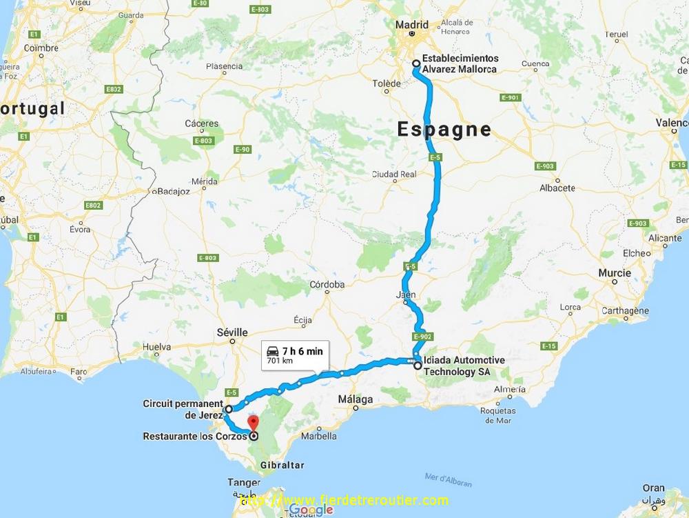 3/4h plus tard, je débarque chez Renault à Churiana, l'endroit est ultra discret, au milieu d'une zone d'habitations, il y avait je pense bien 8 ans que j'y avait plus mis une roue, le quartier a bien changé. Alberto le chef de la mission m'attend comme le lait sur le feu, je repars un peu avant 13h, la paella ne sera pas froide ! Direction plein ouest vers Anquetera, juste après Santa Fe, je passe le mythique garage VeinSur Volvo, je rêve d'y acheter un jeu de bavettes pour la semi, mais j'ai jamais le temps, et j'y passe nettement moins souvent qu'à Girona. Vers Anquetera je croise un vieux contact FB : Javier, c'est marrant parce qu'on s'est croisé de retour du Suède en Allemagne, lui il vit à Granada, je l'ai persuadé que je suis payé comme un Roumain, ça l'a rassuré. Ensuite je coupe à travers par la magnifique route A384, c'est pas très roulant, mais rien que de voir au loin le village d'Olvera ça vaut le coup. A 16h30 je suis au circuit de Jerez, il fait si doux que je peux vider en tee shirt, ma mission est enfin accomplie, je devais vider imperatif pour BMW ce jour. J'ai deux autres teams à poser aussi, mais ils seront là que lundi, je les laisse au box fermé. Une bonne douche plus tard, je roule ma dernière heure dispo, ce qui me fait arriver sur un super parking à l'ombre des Palmiers à Alcalá de los Gazules. IMPECCCCCCCCC !