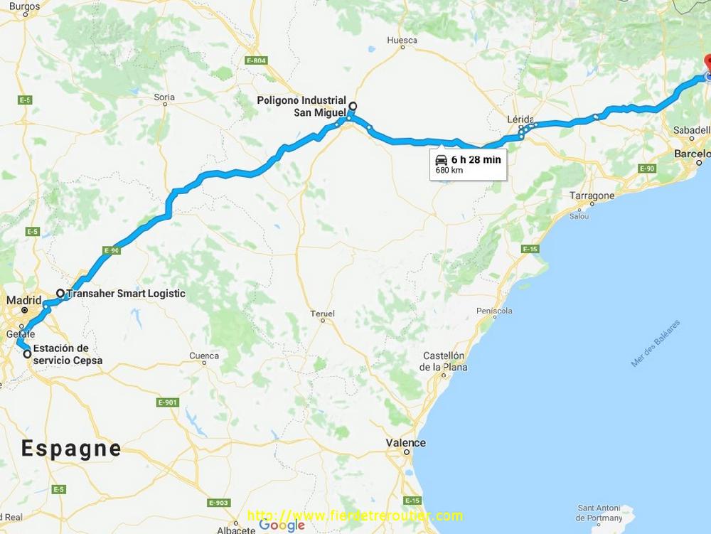 52 minutes plus tard, douche comprise, je finis ma remontée, et j'ai même le temps de faire les pleins du 500 qui depuis Jarcieu à grand soif. Du coup j'arrive pile pour la reprise, chez un transporteur old school, le patron qui a un certain age parle super bien français, c'est rare maintenant en Espagne de tomber sur des gens qui parlent français. Seul problème pour charger, le chauffeur qui a fait la ramasse est parti chez lui avec les papiers. C'est rassurant de voir que je suis pas le seul à faire ce genre de boulettes. En rangeant bien comme il faut les palettes j'arrive à gratter presque 1m sur le metrage annoncé. Il me reste 2m60, donc le chef m'envoie ma dernière ramasse pour demain à Vic, 3m20. Normal. Vu qu'il y a rien qui presse je me cale à 80 sur la natio, et malgré ça je rattrape une colonne de camions. Tout devant, un traco XPO avec un MAN se traine à 70 parfois moins, il ne fait aucun effort pour faciliter le passage, et vu le trafic soutenu on frole plusieurs fois la catastrophe, j'ai pû le passer bien après Candasnos, et encore le mec regardait de travers, y a des claques qui se perdent. A 20h, j'arrive à Vic, 8h40 de guidon, et je me pose au seul quai qui reste accéssible H24 sur toute l'Espagne !