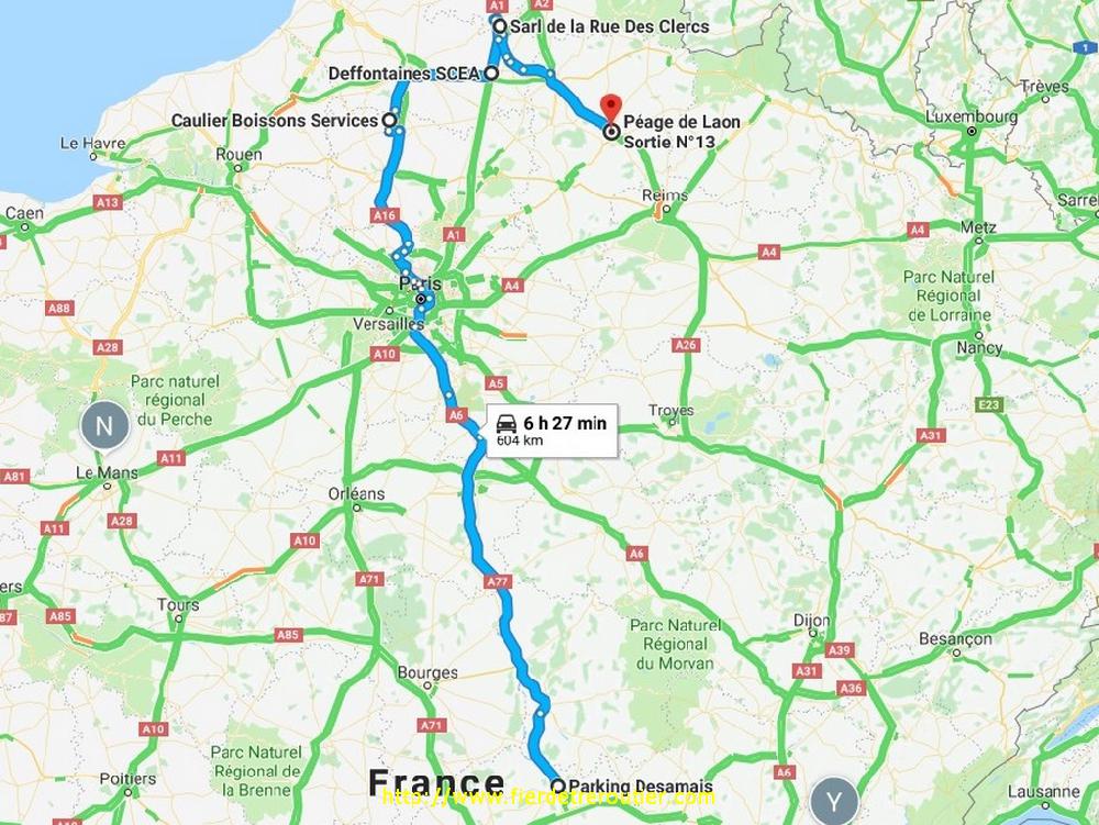 Je mets le cap au nord, direction un haut lieu ferroviaire, la Gare TGV des Betteraves. Comme toute gare TGV qui se respecte, elle est moche, loin de tout et partout il y a des voitures garées à l'arrache. Triste spectacle. Juste à côté de la gare, il y a une ZA, je charge là 4 bigs bags de PDT, mais bio. Le tout pour la plus grande fabrique de chips d'Ardeche. Mais voilà, j'arrive pile pour la pause à 13h00, ça reprend à 14h. La reprise a été laborieuse, du coup c'était 14h30 que je suis reparti. L'autre ramasse est au sud de Bapaume, le cariste est un bon, mais son téléphone arrête pas de sonner, et mine de rien, c'est 16h quand je repars de là. Ce soir j'ai la ferme intention de caler une 11h, je descends quand même jusqu'à Laon, ou je vais me planquer dans la ZA derrière le péage, 17h15, fin des operation avec mine de rien pas loin de 8h45 de guidon. Comme il reste 2m de plancher, le chef m'envoie une ramasse sur Auxerre, bon, c'est mort, je livrerai pas mes patates demain à Boffres.