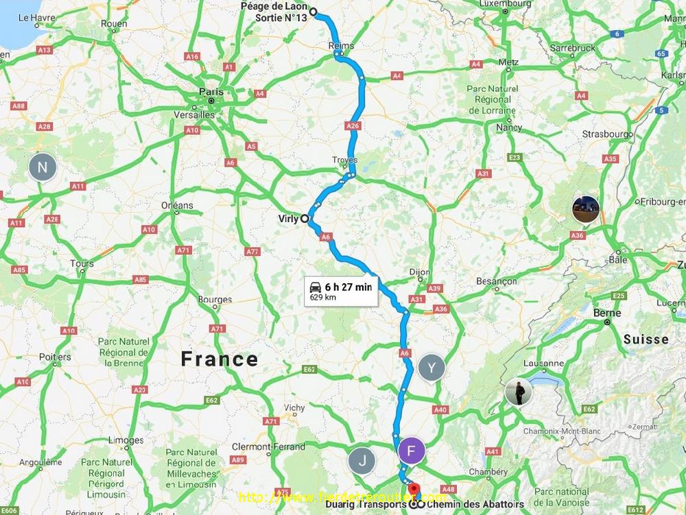 Parce qu'il faut bien être courageux quand même, il est 4h20 quand je laisse mon petit bout de parking, dans le coin la nuit, ça fait des relais à gogo, autour y a pas mal de STH. Chacun ses goûts et ses couleurs, mais franchement, faire des relais et des nuits, c'est pas un boulot qui me brancherai, ne pas faire un voyage de bout en bout, ça doit donner un sentiment d'inachevé ? Sur l'A26, ça roule tranquille, un peu partout les parkings deguelent de camions jusque sur les bandes d'arrêt d'urgence, il faut déjà avoir confiance en son prochain pour dormir sur une bande d'arrêt d'urgence. Je quitte juste un peu au nord de Troyes dans l'Aube, la route est grasse, boueuse. La N77 commence doucement à se charger dans l'autre sens, mais de mon côté ça roule. Avec en prime une croisette avec Nico38 qui roule au taquet en R730, et un coup de flash dans le dernier bled avant Auxerre ça fait rentrer un peu la monnaie dans les caisses, c'est le jeu de la vie.