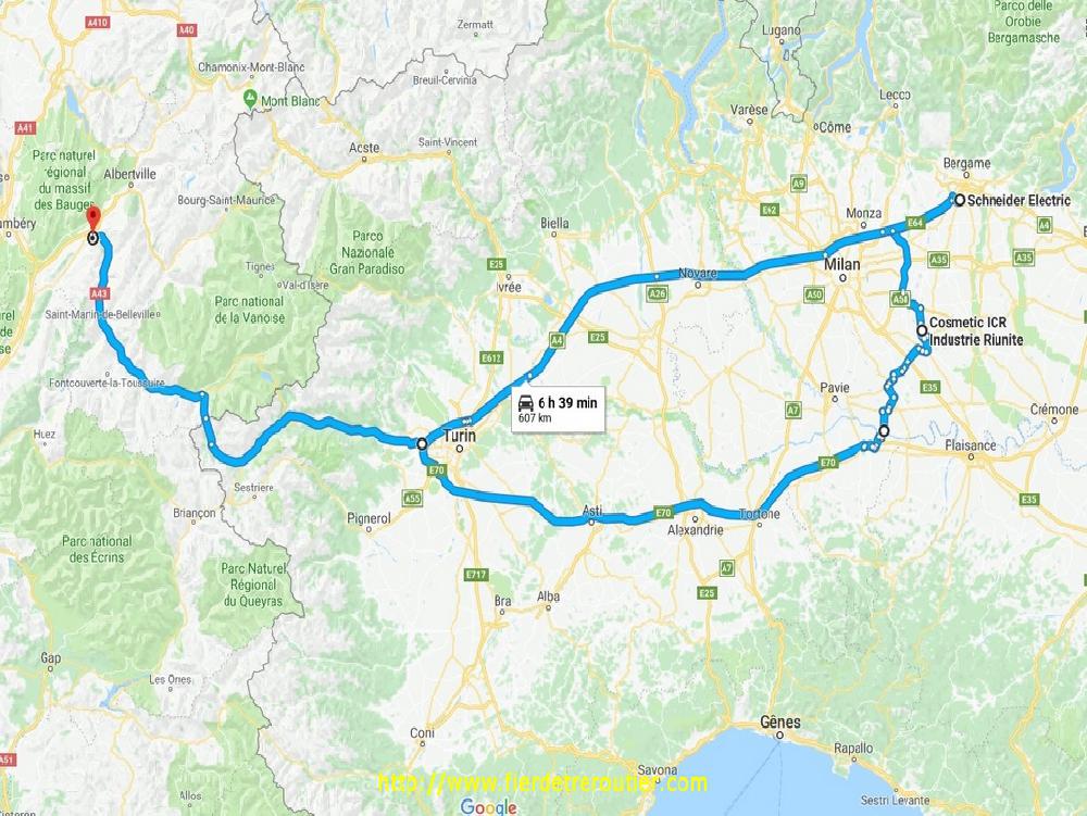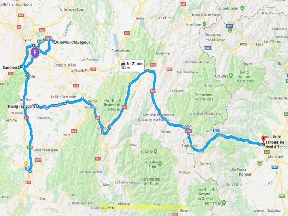 Moi qui pensais completer au dépôt pour le 60, je vide tout, et je me retrouve à la tête d'un complet 67 palettes pour Lodi ! Cool, je peux remettre ma casquette d'international Driver. Lodi c'est que la Lombardie, mais ça me va très bien car je me contente de peu, nous sommes en 2018. A 16h, je suis prêt, et GOOO ! Vu l'heure bien sûr j'évite la traversée de Grenoble, je fais le tour par Chambery tout good. Pas un chat au tunnel si bien que je me pose au péage de Rivoli avec 8h40, ça suffira pour un lundi.