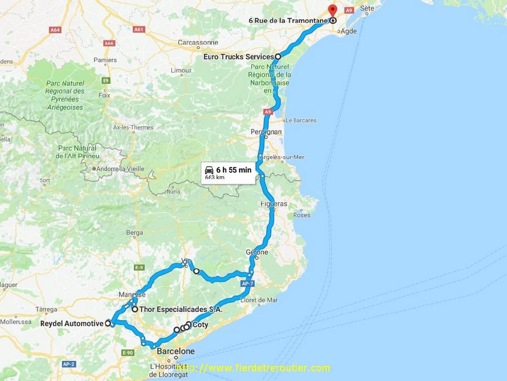 Je pars donc avec un mélange de tristesse et de colère à 0h45. Je pensais être tout seul, mais pas mal de collègues sont déjà en route, la flotte fait son apparition vers Nimes, elle ne me quittera pas de la journée. Passé Perpignan j'ai mes 4h, je me pose en paquet de merde sur un parking histoire de recuperer un peu. 50 minutes de sièste qui font du bien quand même. Je debarque chez Santi un peu avant l'ouverture il est 6h45. Vu l'heure, je vais me taper le bouchon après La Roca Del Vallès, en grugeant un peu j'arrive à remonter 1 bon kilomètre du bouchon c'est toujours ça de gagné si bien que je me pose à Polinya à presque 8h30, il y a des camions dans tous les sens, je crains le pire. Mais j'ai que 3 palettes et j'ai pû passer entre 2 complets, le cariste était bien luné.