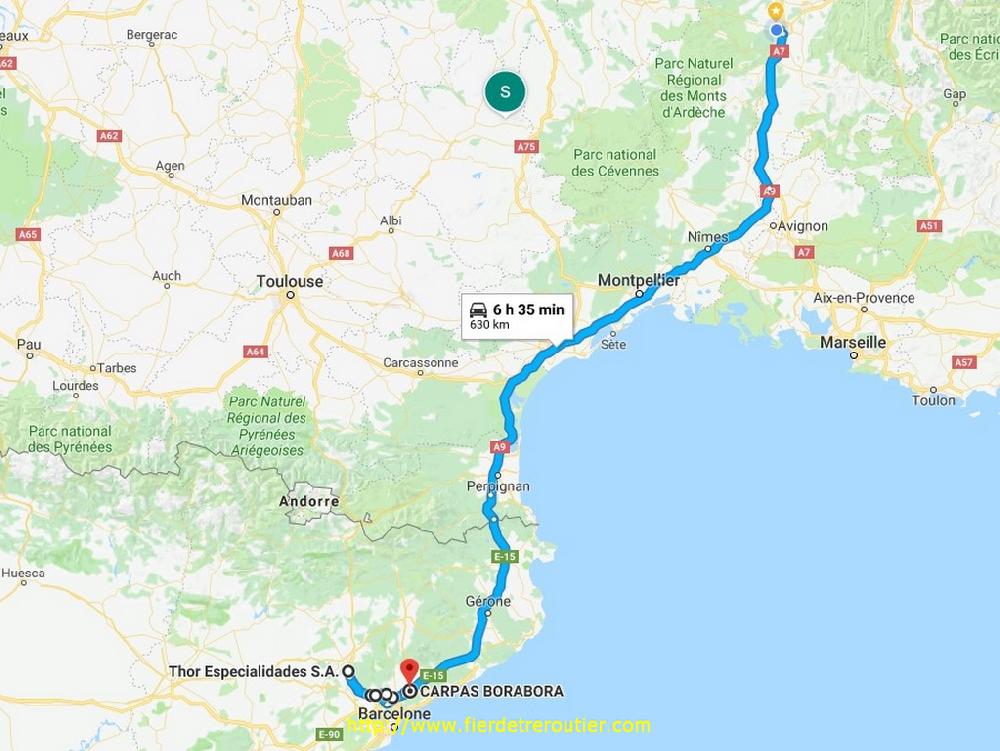 A La Jonquera, la Guardia Civil refait le même plan, armés jusqu'aux dents que la semaine passée, grosse chicane, on se demande à quoi ça sert cette mise en scène, d'autant que si on sort à la première sortie La Jonquera, il n'y aucun contrôles, jamais. Le soleil disparait, il fait moche sur la Catalogne. A 11h30 j'arrive chez le premier client à Celra, une grande plateforme dédiée aux articles de sport sur internet, je connaissais pas les horaires de reception, en fait c'est facile : 6h-22h non stop. J'ai juste 4 palettes à poser, en 5 minutes c'est réglé, et comme il est presque midi j'ai les crocs alors je fais un graillon. Je croise ensuite Aurélien à la discothèque à Montornès, vu l'heure évidement, on se voit juste sur le grand parking et pour que je lui récupère 2 piles de rolls vides. Je finis ma petite tournée au port de Barcelone, chez le client on approche la fin de journée, j'attends pas sur le parking et juste 35 minutes à quai pour vider.