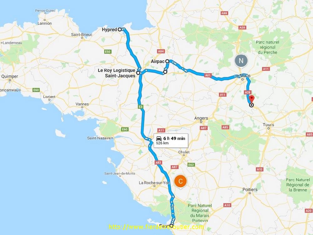 Pas de bol, arrivé au pire endroit de la terre, à savoir le periph de Bordeaux, je tombe nez à nez avec une bourrasque de neige, heureusement ça dure pas trop. Comme les prévisions ne sont pas bonnes plus haut, pour rejoindre Dinard, je coupe par La Rochelle, à ce qu'il parait le transit est interdit, mais si ça se trouve, ils sont capables de nous bloquer à Niort s'il neige à Paris, c'est déjà arrivé, une fois ils bloquaient à Nimes parce qu'il neigeait à Lyon, plus rien ne m'étonne. Du coup, je me suis posé dans la grande ZI de La Rochelle, ou, comme dans toutes les ZI de France il n'y a pas de places pour stationner en camion, on marche sur la tête, j'ai mis quand même pas loin de 10 minutes avant de trouver une chaussure à mon pied de 16m50. 15h, fin des opérations.
