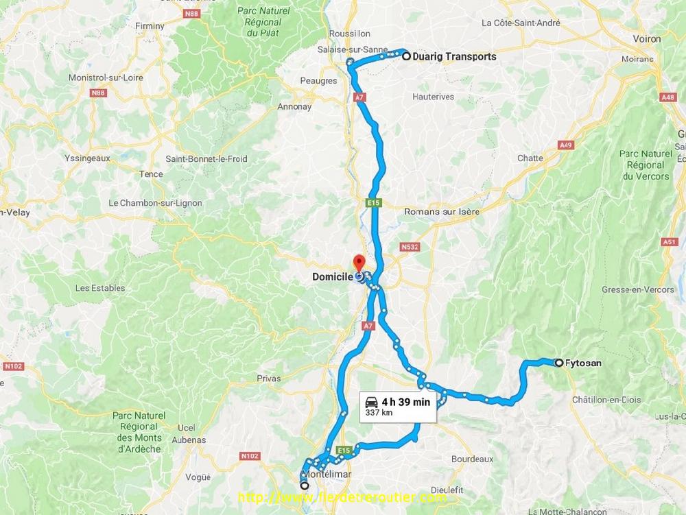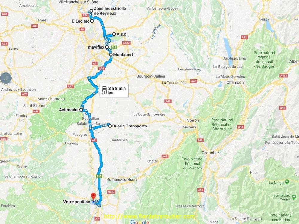 Finalement c'est la bon plan ce bout de zone, j'ai pas été dérangé. Y a juste un Capelle qui devait connaitre qui est arrivé dans la soirée. Je demarre à 7h45 pendant que les ouvriers envahissent la ZI. C'est relativement calme sur l'A9,je me cale comme un bon soldat c'est bon j'ai grave le temps de vivre. Arrivé à Montélimar comme par hasard j'en ai marre et je vais roucouler sous le jacuzzi N°4. A midi je me pointe au 98 de la ZA des Blaches à F - 38270 Jarcieu.