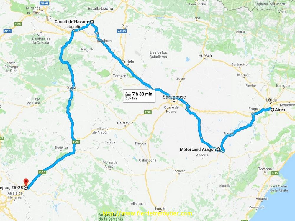 Etrangement, quand je repars 20 minutes plus tard, le soleil a carrement disparu, je le reverrai pas de la journée. Direction plein ouest vers Zaragoza, la temperature a le plus grand mal à grimper aujourd'hui, on plafonne a 2 ou 3 degrés, il tombe même quelques flocons après Zaragoza, les montagnes sont bien blanches, bref c'est l'hiver aujourd'hui dans le coin. Je coupe une petite demi heure sur Tudela, et je me radine juste un peu avant 14h au circuit à Los Arcos, le circuit de Navarra. Pas de bol, c'est l'heure de la pause, et de toutes façons, le proposé aux box n'est pas là. A 15h, on vient me chercher, je m'étais mis au pif presque au bon endroit, et une fois vide je me fais ouvrir une douche, parce que faut pas deconner ! Il caille tellement que l'eau chaude tarde à venir et finit tiedasse sur ma peau sensible. Bon, j'ai pas trainé sous la flotte, je la soupsonne d'être de mêche avec le patronnat pour pas qu'on traine.