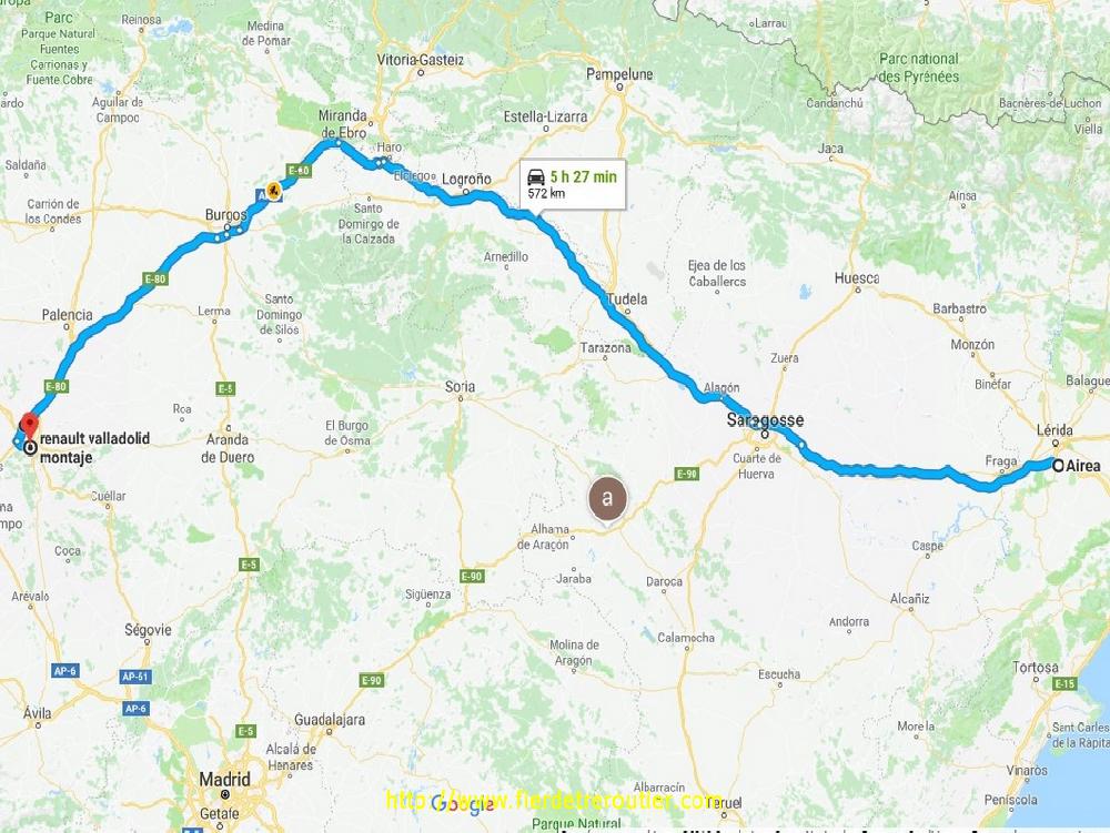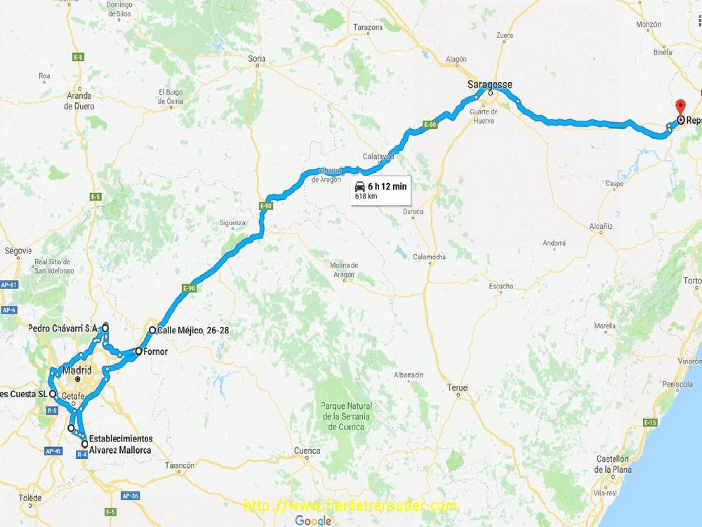 La suite se fait à Fuente el Saz de Jarama, dans un Poligono industrial si vieux que les rues sont mêmes pas goudronnées, le batiment date aussi du siècle d'avant. Je charge des bout de chenilles de Caterpillar pour le 84, vraiment old school le coin, mais super cool chez le client, ça se prend pas la courge. Ensuite, j'ai encore 25 palettes de bazar à prendre à Azuqueca de Henares pour le 69. Il faut que je négocie de tout sortir pour remettre dans le bon ordre. Ils sont sympas ici aussi, mais j'ai attendu 2h un quai libre, mais le principal c'est bien que la semi soit bien rangée, et surtout bien pleine. L'amplitude a pris un sacré coup derrière les oreilles. Il pleuvasse tout le long du trajet après Guadalajara, il y a pas mal de monde sur la route cet apreme, il doit y avoir des vacances ici aussi, grosse frayeur dans un virage, j'étais en train de doubler virilement quand tout était arrété un peu plus loin, merci l'ABS, sur le mouillé, j'ai fait de l'huile ! Doucha habituelle à El Navarro, je termine ma palpitante journée à Fraga, à deux pas de la Catalogne, je passerai la frontière demain, au calme !