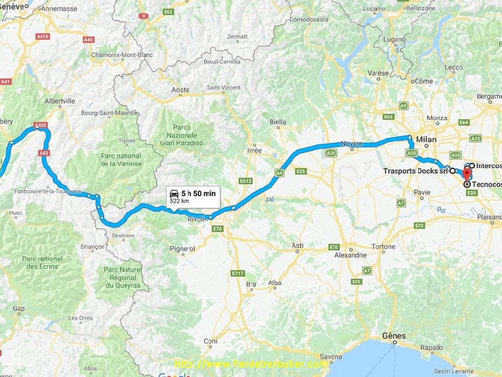 De là, je file à Settimo, malgré la pluie qui n'a pas arrété, ça roule nickel encore pour contourner Milan, ce qui m'arrange. Entre les interdictions de partout, c'est bien le casse tête pour arriver dans la petite ZI, je charge des grosses palettes d'équipement electrique, 8m annoncés, mais ça tient sur 7, en Italie c'est rare, c'est plutôt l'inverse. Je ressors de Milan et c'est bien galère d'ici pour rechoper l'autoroute, au passage je suis passé par hasard devant l'ancien dépôt Italsempionnne ou je livrais souvent du temps de chez Lubac, je pensais que ça avait été rasé car on le voit plus depuis l'A4, mais il est toujours là. Plus je m'approche de Turin, plus la température baisse, et la pluie se transforme en neige à l'approche de Susa. Je fais mes 45 sous la douche. Heureusement, l'A32 est pratiquement toute sous des tunnels jusqu'à Oulx, ou il neige à plein. Je craignais le pire sur la dernière partie jusqu'à la plateforme, mais là, il ne neigeait presque pas, en tous cas, c'est salé à mort, t'as l'impression de rouler sur des chips. Je me suis finalement posé un peu avant 22h30 dans la zi de Genay au nord de Lyon avec 9h30 de volant, impeccable.