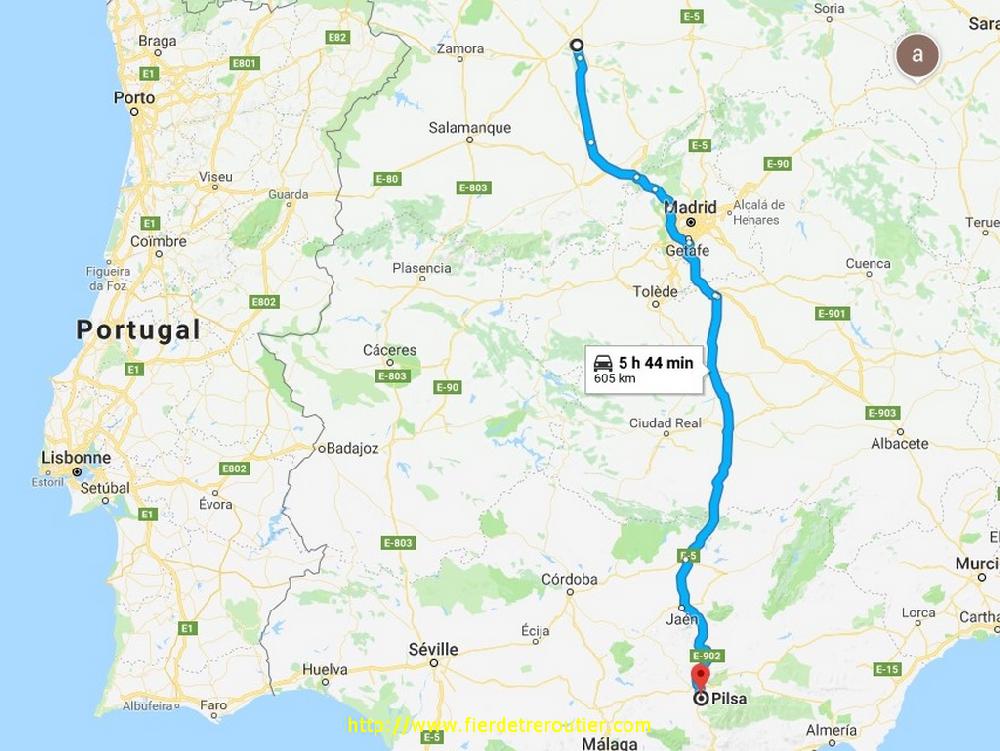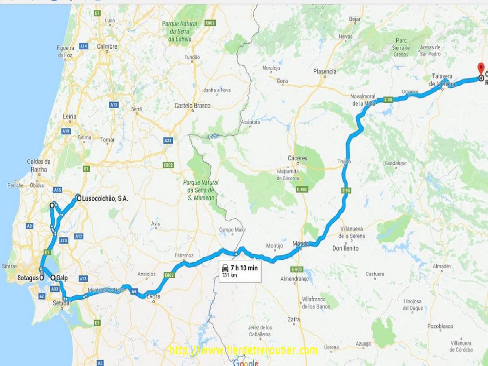 On s'éternise pas, il est déjà 12h30 quand on repart de Varzea, il faudra tout pour être à 14h à la douane de Lisbonne. Heureusement la pluie s'est calmée un peu et surtout d'arriver heures creuses dans la capitale ça va bien. Le quartier moderne gagne toujours du terrain, et surtout l'immense rond point du 23 avril n'exsite plus, il y a des travaux partout. A 14h pile j'arrive à SOTAGUS, la douane du parc à containers, une demi heure plus tard Arturo débarque avec mes papiers, les douaniers ont renoncé à faire une visite, avec cette nouvelle loi 100% portugaise, si je sors du circuit le jeudi, j'ai pas la douane avant le lundi soir !! Truc de ouf en Europe en 2018. On sort rapidos de Lisbonne et au 3e passage sur le Pont Vasco de Gama on y voit à peu près loin. L'objectif maintenant c'est de monter le plus loin possible, fini de musarder, autoroute à TOPE ! Bibi essuie sa larmiche en quittant le Portugal à Elvas, bienvenidos en Espana... On essuie une mini tornade à Badajoz, on y voit pas à 20m, on commence à être rodés. Je refais un complément de gasoil chez le Portugais, je ferai un vrai plein lundi. On se pose à 23h30 à Sta Olalla à moins de 100km de madrid, il y en a assez pour un vendredi.