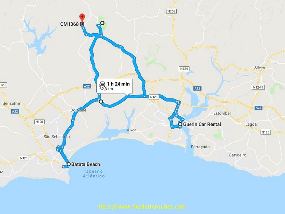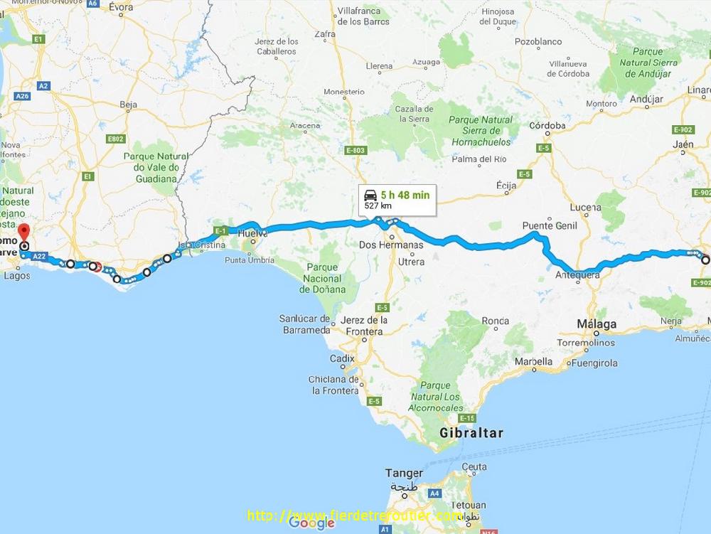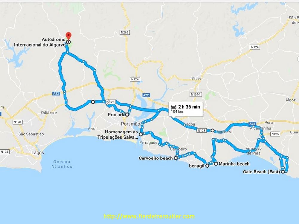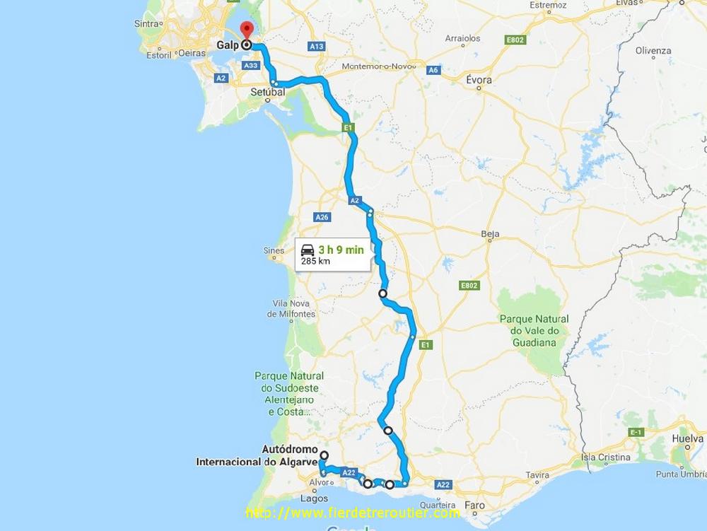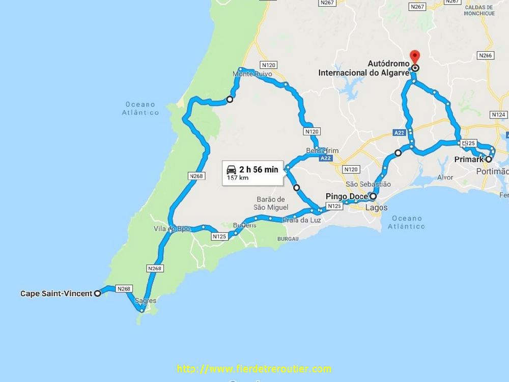 Après 30 minutes d'une dernière pause espagnole, on reprend de plus belle, et toujours sous les millions de litre d'eau, la situation ne s'améliore pas passé la frontière du Portugal. Mais comme j'ai largement le temps je prends la nationale histoire de faire un peu de tourisme. Il pleut avec tellment de vent que je me dis que ça va finir par se calmer en me garant sur un pauvre parking, et j'ai bien fait, 20 minutes plus tard le robinet de ferme et le soleil vient enfin un peu nous accompagner sur la dernière partie du trajet, ça fait vraiment plaisir de voir un peu de lumière et notre moral remonter un peu ! A 17h, on finit par arriver au circuit, garés pour le week-end et même un peu plus !