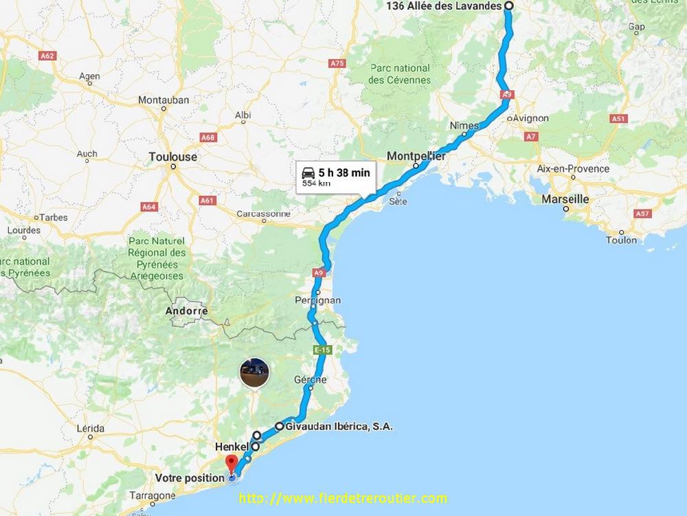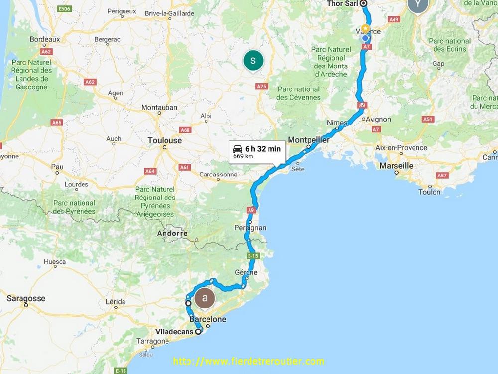 Il fait quasi beau quand je repars à midi et des chorizos, je stoppe au premier parking direction Manresa pour faire un graillon et un bon coup de ménage, pour un peu j'aurai presque fait une sieste, mais il faut pas exagerer quand même, on est pas encore en week-end. A Girona, je quitte la calme de la C25 pour rejoindre l'AP7, il y a du monde cet après-midi, je monte cool, y a le temps calage à 82. Dernière coupure à Loupian ou il tombe des gouttes grosses comme le poing, il pleut jamais dans le 34. Il est quasi 22h quand je finis par me garer au plus près du client, le long de la voie SNCF pour dormir c'est le top !