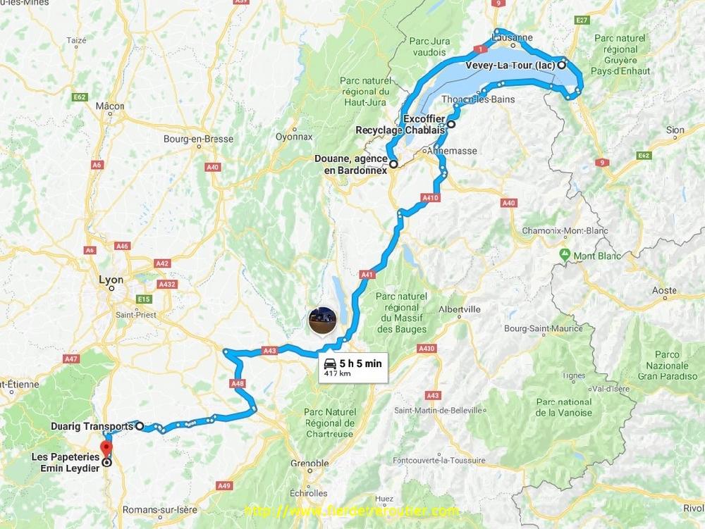 A 12h07, la semi était fermée, balayée et vide, autant dire que ça a bien marché. Mon escapade Suisse se racourci considérablement à la lecture du texto que m'a envoyé Maxime, à savoir un rechargemet à Bons en Chablais dans le departement 74. Ma carte Michelin m'indique que le mieux c'est passer par St Gingolph, de toutes façons y a pas 50 routes. Le parking de la sortie est fulle de chez full, il faut dire qu'il n'y a que 2 places, ça limite aussi... Je me gare à l'arrache et retour en France, cassage de graine au bord du lac face à Vevey, au bord de la ligne de Chemin de fer abandonnée, le prix du m² est surment nettement moins élevé, pourquoi rien ne marche de ce côté-ci ?? Je recharge un complet de balles de papier pour recyclage, mine de rien ça a pris 2h. Je repars à presque 40T, il y en a bien assez, avec toutes les côtes qu'il y a, il va souffrir un peu le 500. Ces derniers temps il est un peu trop habitué à trainer une semi avec les essieux relevés. Crochet par la kommandantur histoire de passer à la Karcher et je vais me poser à Laveyron ou il reste une place, 20h ridal !