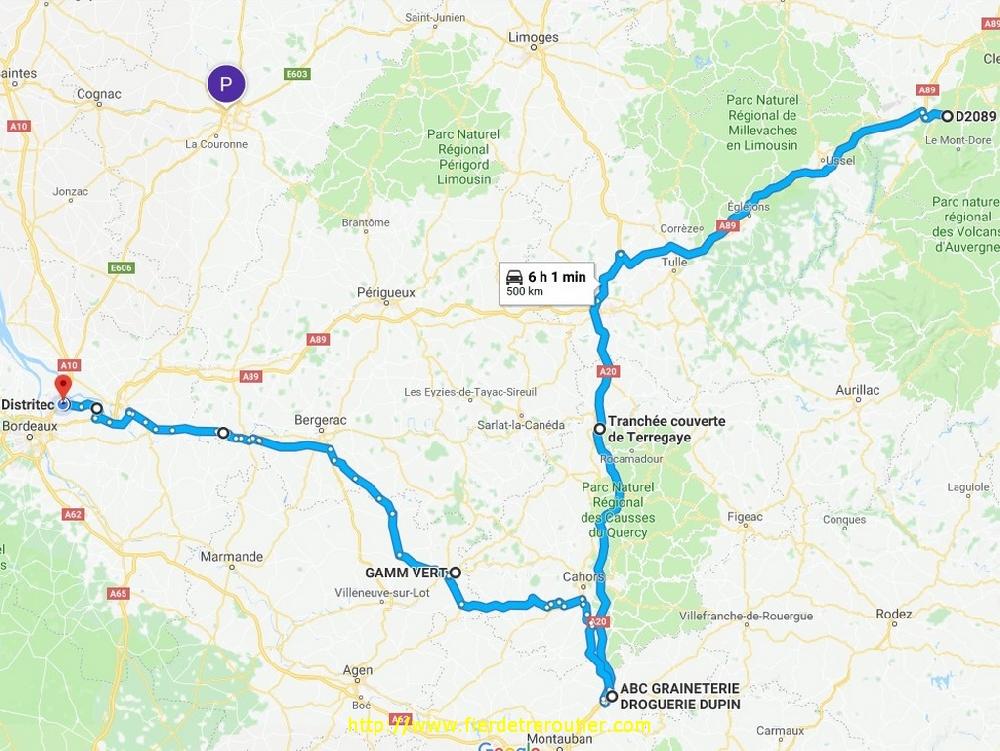 Au reveil, il meule sa race. Ici c'est pas Laqueuille que ça devrait s'appeler mais Laquaille ! -7 au compteur, 9h03 de repos, le frigo qui tourne, impec let's go. Quelques kilomètres plus loin j'attrape l'a89 qui se reveille doucement, le soleil est de la partie ce matin c'est joli, à Amiens, ils ont 1000 vaches dans un entrepôt, ici c'est 1000 vaches sur le plateau, autant dire que le veau et sa vache y sont bien plus heureux. Mon premier client se trouve un peu au sud de Brives à Les Quatre Routes du Lot, mais faut juste que je trouve la bonne pour y aller. J'opte donc pour la sortie 52 sur l'A20. A Noailles, la route que je voulais prendre est marquée interdite aux 3t5. Naievement, je me dis qu'il doit y avoir une déviarion juste après, mais non, je suis juste obligé de me taper une poignée de lacets avant de pouvoir faire 1/2 tour et revenir, je prends l'interdiction, c'est marqué sauf riverains, sauf livraison. Y avait juste à passer une rue pas très large, et puis zou. A 9h je suis à la jardinerie, pile poil pour l'ouverture, comme ça a bien gelé, la fille regarde en premier la gueule des feuilles, elle a dit, PARFAIT !