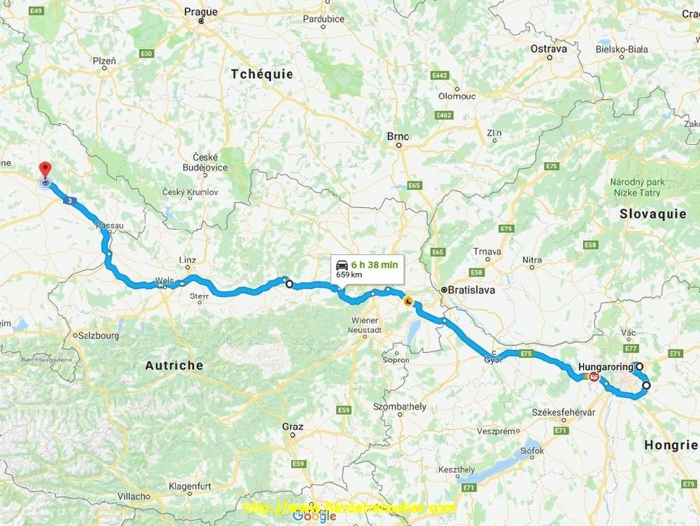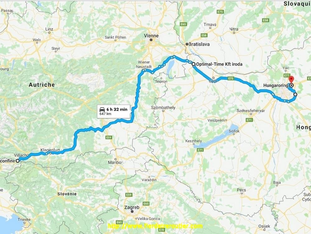 15 minutes après, je suis à Mosonmagyaróvár dans la zone industrielle pour faire la douane. Le mec m'annonce 20 minutes, et puis finalement, ça se transforme en plus d'1h30. A la fin, je signe une pile de déclarations haute comme mon camion, 15 clients, 6 produits differents, c'est pas au point leur truc. Chaque pays est différent, je comprendrai jamais rien aux douanes. Ensuite c'est l'ennui absolu jusqu'à Budapest. Il faut savoir qu'en Hongrie il est interdit de doubler aux PL sur l'autoroute, alors je me suis calé à 80, mais même à 80 tu arrives à rattraper des mecs qui roulent encore moins vite, évidement au bout d'un moment tu craques, j'ai eu chaud au cul, j'ai doublé un caravanier Finlandais qui se trainait à 60, les flics étaient embusqués juste après, ils ont rien vu. Le pire c'est après sur le M0, l'équivalent de notre A86, il y a plein de travaux. Google map me propose bien des alternatives, mais voilà, j'ai le ticket et un itinéraire fixe. Je finis par arriver à 16h30 au circuit d'Hungaroring, c'est aussi en travaux si bien que j'accède par la piste au paddock F2, j'avoue que j'ai hésité 5 minutes avant de m'y engager.