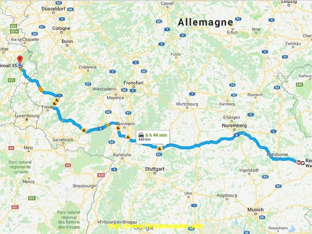 Dernière ligne droite allemande par l'A60 pour prendre la direction de la Belgique, une fois passé la frontière, et ben, pareil, des travaix, des travaux, ça roule pas, quand on est à 60 c'est bien le maximum. Avant d'aller m'enterrer au paddock à Spa, je fais un coup de provisions au carrefour Market de Stavelot, on peut se garer facilement. A 19h je me gare au milieu des copains du week-end, il fait une chaleur inédite à Spa, là ou d'habitude on respire, on dépasse les 30°, c'est juste incroyable ! Même le plus vieux des Belges n'avait encore jamais vu ça !! On aura pas froid pour distribuer ce week end !