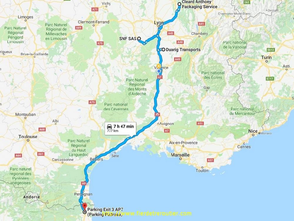 Je traine pas trop quand même, et je fonce sur St Etienne, il y a juste un petit bouchon à Vienne, ensuite nickel. Arrivé à l'usine à St Etienne, je m'appretais à glander un bon moment, mais l'incroyable s'est produit, à peine je m'étais inscrit que déjà mon numéro s'affichait, c'est incroyable mais vrai comme disait Jacques Martin dans les années 80 ! Le temps d'enfiler la côte ça charge en moins de 45 minutes, c'est qui m'arrange énormement, et oui... Quand je repars les compteurs n'ont pas été remis à 0, et demain étant le 1er août, les horaires changent, il n'y a plus de déchargement l'après-midi, autant dire qu'il faut faire tourner les bielles. La météo ne s'est pas trompé la temperature grimpe à une vitesse folle, il fait 38 à Valence. 30 minutes de repos à Tavel, et ce soir je suis bien décidé à faire pêter 10h de volant, histoire de passer le Perthus à la fraiche sans les touristes qui vont claquer leurs économies à la Jonquera. Quand je me pose à 23h15 à Guantanomo Padrosa au milieu du parking frigos, là ou il y a le moins de monde en fait, il fait encore 30°, pas un brin d'air, mortel !