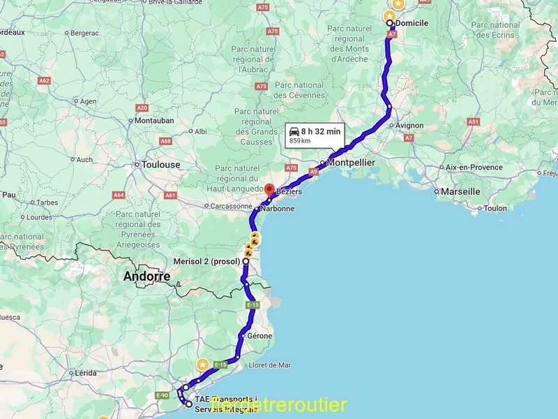 Je m'arrange avec Kévin chef de quai chez Fourka Family qui me donne le feu vert pour acular pronto. Il est 16:30. Aussitôt en place je me jette sous la douche, je suis presque chargé quand j'ai fini. Bien sûr je pars en pleine binz, mais à force de feinter je limite un peu les dégâts, 1:10 à la Roca. Bien sûr j'ai averti le premier client à Bourg St Andeol, arrivée prévue entre 00:30 et 00:45. Après Barcelone ça roule tranquille c'est même plutôt calme. Les 4h15 sonnent à 2km de loupian, parfait, j'ai faim.