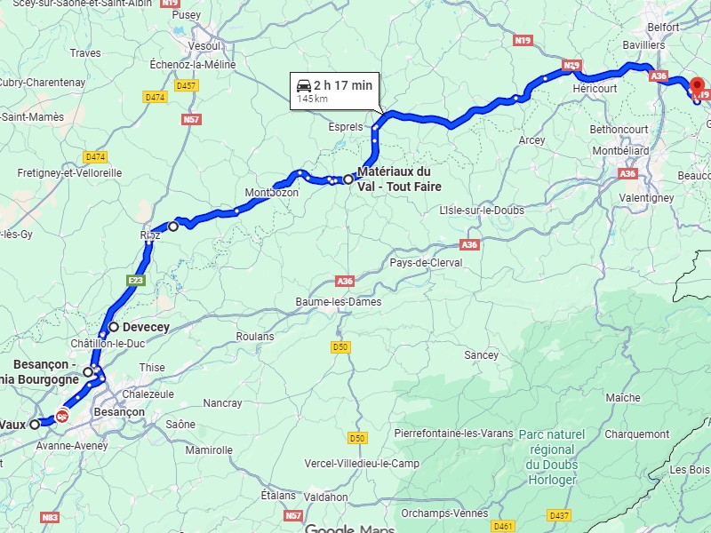 Je casse la graine après Rioz et à 13h je suis chez Tout Faire à Rougemont. La grille ne s'ouvre qu'à 13h30 mais ça file. Je suis le seul camion, les caristes se mettent à deux, je suis satellisé autour de la remorque.