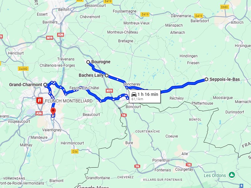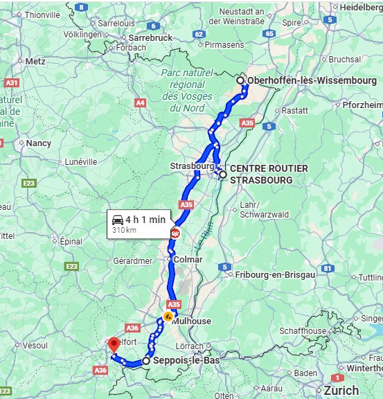 Lundi je m'étais annoncé à Laurence, quand je lui ai dit que je finissais vendredi dans le 67 pour rechargement Seppois elle m'a répondu : « je te souhaite une bonne semaine. »On n'a évidemment pas le temps de recharger. Il y a quand même 204km jusqu'à Seppois, c'est grand l'Alsace vindiou.