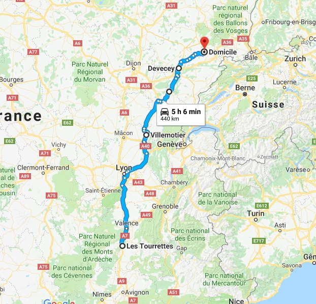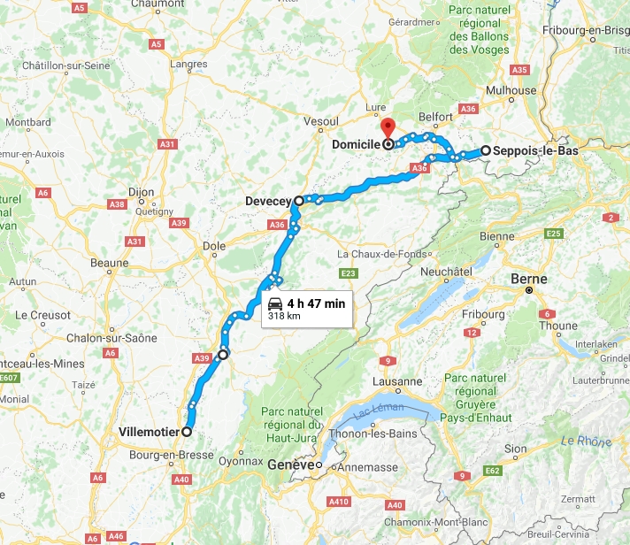 On finit à Madrid donc je voudrais garder mes 10h pour plus tard, j'ai compté, ça va passer en 9. Donc le plus rapide c'est Besac', la 83, puis l'autoroute à Poligny. Je ne prends que rarement l'A39 mais je sais pourquoi, on ne gagne que quelques minutes et c'est d'un ennui mortel.