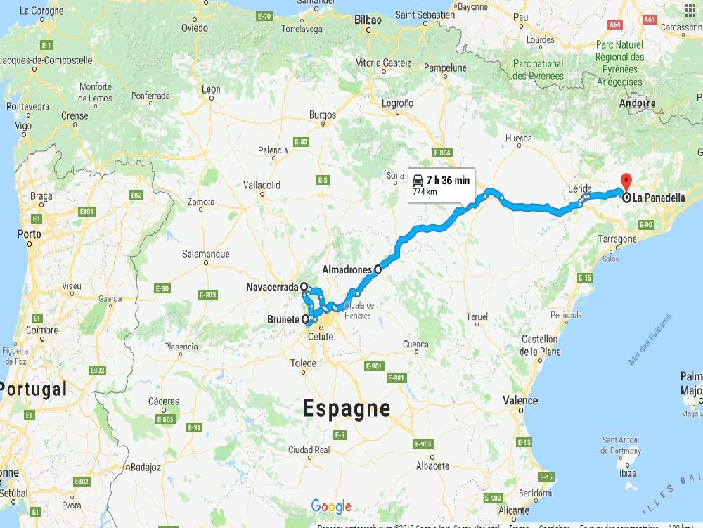 Ma grosse feignasse reste au lit, je me lève à 6h, je vais boire mon café, et quand les neuf heures sont écoulées, je décolle. Je check Google, il me fait passer par le R2 à péage pour éviter le bordel sur la M40. Tant pis pour le péage, faut avancer. Mon copilote se lève enfin, sur le contournement de Madrid. On s'arrête à une station, pour le pipi du matin et prendre du pain par la même occasion. A huit heures et demi je suis à Brunete, livraison assez facile, juste qu'il faut se payer les colis à la main au milieu de trois chiens un peu pénibles.