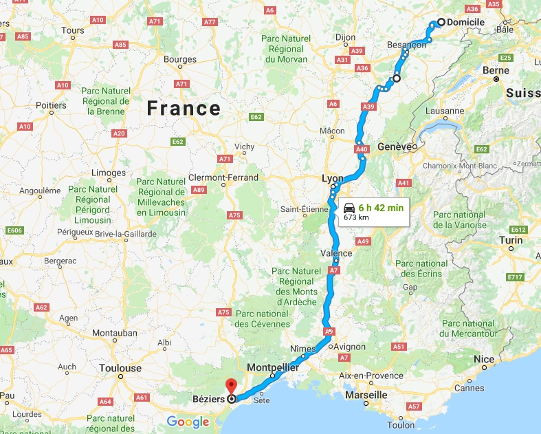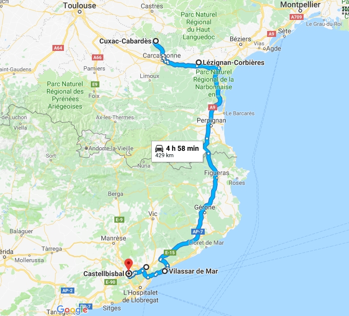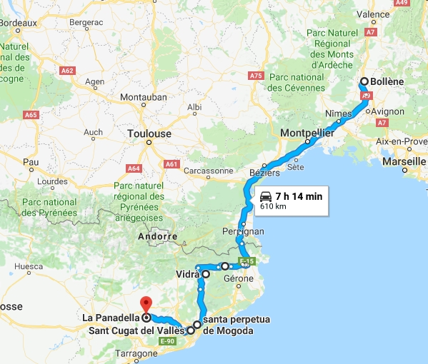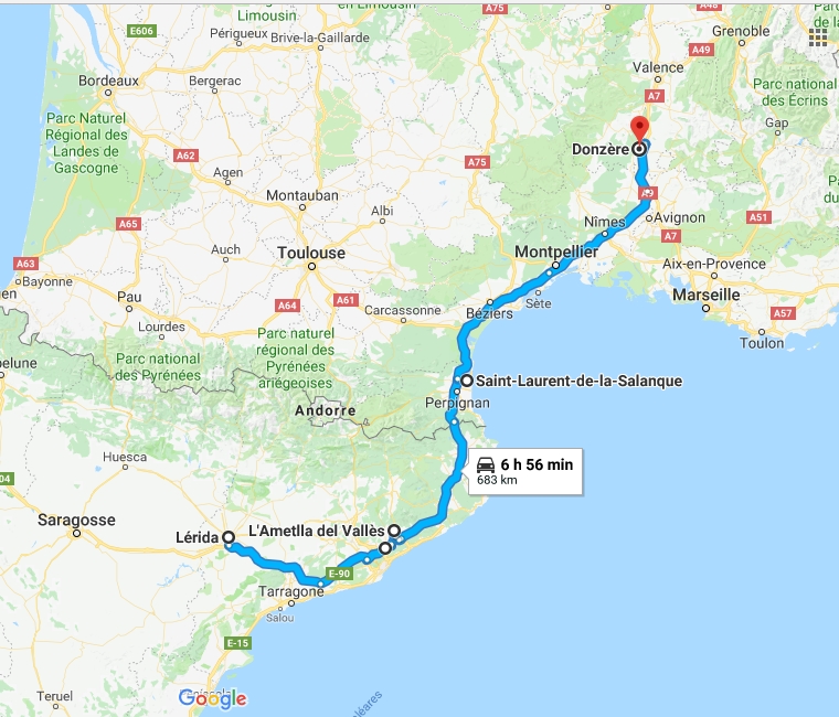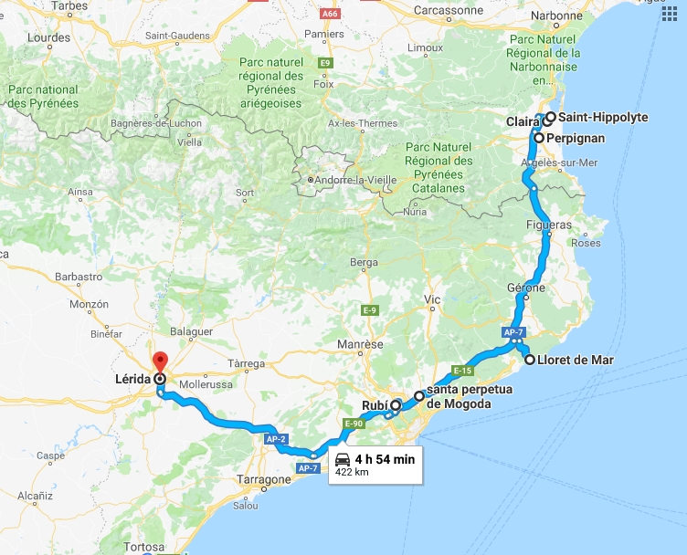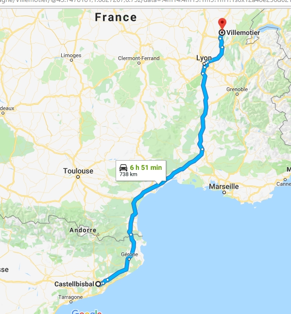 Je file parce que j'ai rendez-vous avec Nestor à Barcelone à 13h. Laurence m'a envoyé mon rechargement, je jette un œil sur Gougueule, c'est une grosse boîte de ferraille, j'ai bien peur que ce soit celle qu'on voit depuis l'AP7. Je me prends donc du pain à Carca en passant pour ce midi et ce soir...