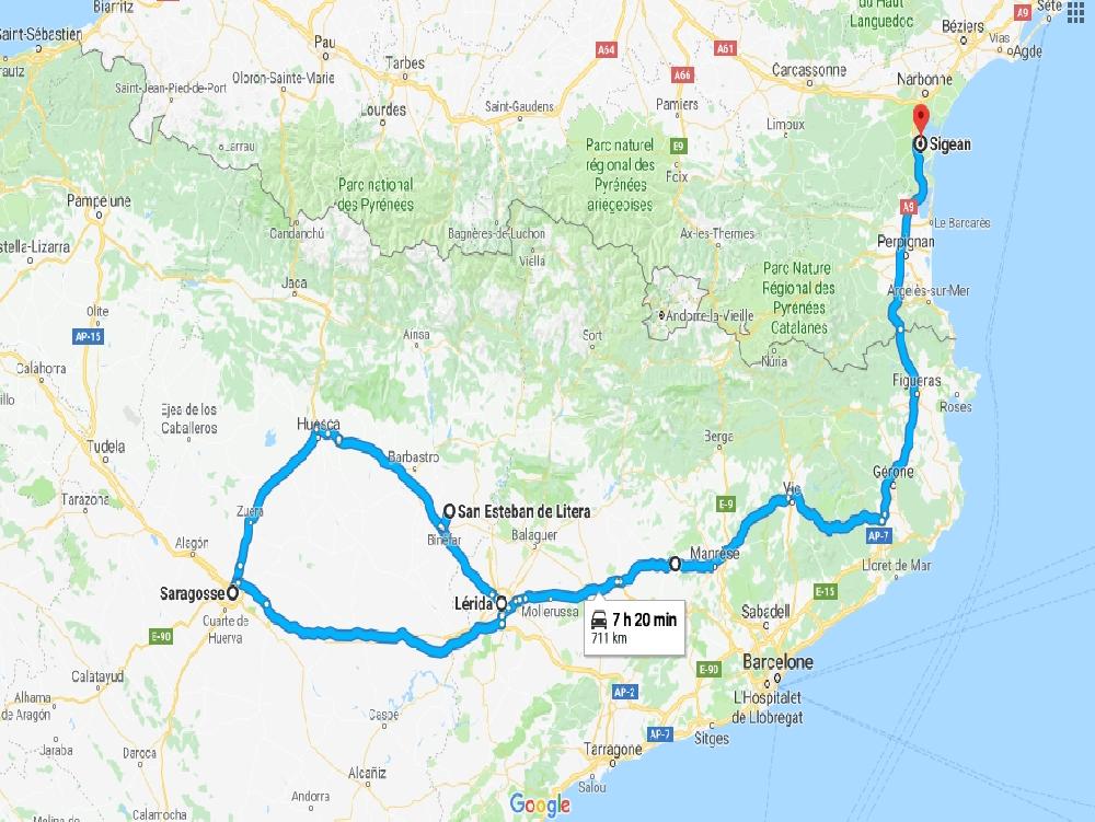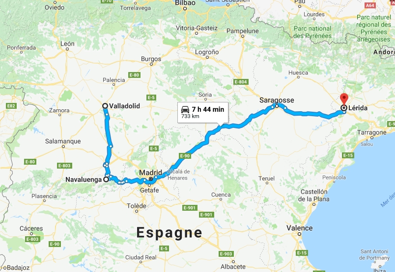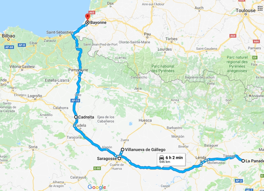 Comme d'hab' Laurence m'a envoyé mon retour hier, on recharge à Saragosse. J'ai rendez-vous entre 11h et midi ça va aller ric-rac. J'ai même le temps d'un arrêt pipi-cortado vers Huesca. Vous allez me dire que boire un café à un arrêt pipi c'est contradictoire puis que ça redonne envie mais le café en Espagne c'est une tuerie de la mort.