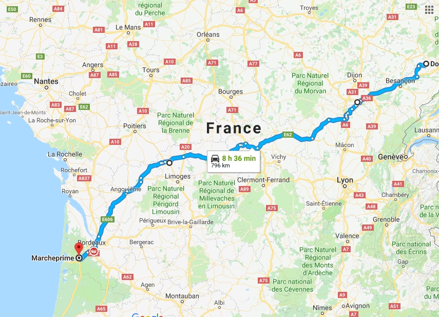 Je pensais finir la journée à Bordeaux lac pour manger le couscous chez les Marocains mais mon histoire a fort bien marché, je n'ai que 9h25 de volant, c'est ballot de s'arrêter surtout que j'ai une grosse semaine en heures de conduite. Je pousse jusqu'à Marcheprime, je passe des Marocains aux Portugais. J'ai 9h59 de guidon, optimisation maximale. Le parking est à 1km du resto en gros, je prends la navette à l'aller et je marche au retour, c'est bon pour la digestion. Arrivé presque au parking je tombe sur JU68 qui savait que j'étais là grâce à Google et Greg 26. Trop bien. Demi-tour, pour un demi, en terrasse. Trop cool cette histoire.