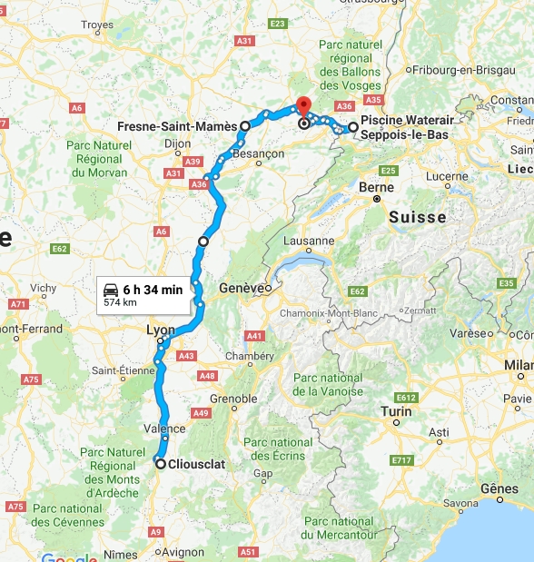 Réveil 3h28, décollage immédiat. Ça va aller pile poil pour vider Etupes avant midi. A 5h et demi Lyon c'est bien tranquille. J'ai même le temps de sortir à Bourg. Coupure à Villemotier, je dors un quart d'heure puis café croissant douche. Il n'y a personne sur le parking, bah oui la 83 est coupée à Coligny dans les interminables travaux. Ici on aura mis autant de temps pour raser deux baraques que les Espagnols pour déplacer l'A2 dans le col de Morata ! La déviation nous fait passer sous un pont voûté, 4m sur les bords ça passe large, on reprend l'A39 pas loin, on ne perd pas trop de temps finalement.