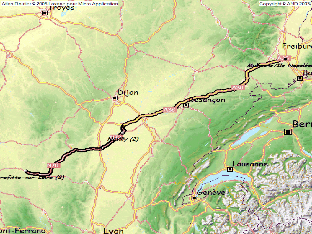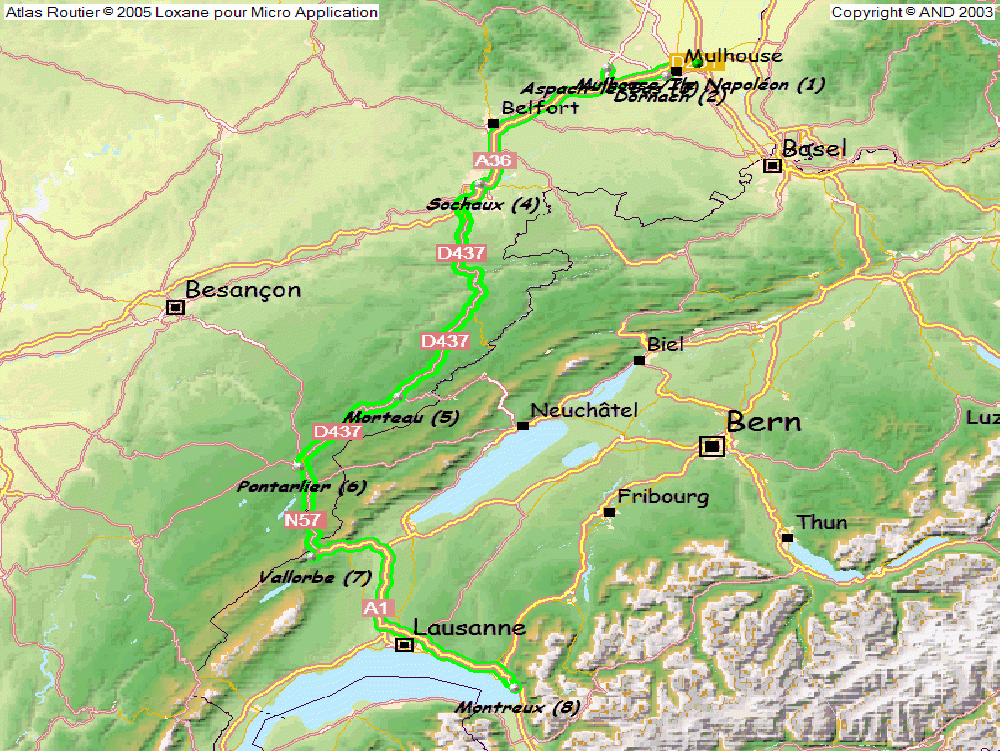 Direction Delle à travers, par le Sundgau. Faut le même temps que par tout l’autoroute, mais y a bien moins de bornes. Faut juste pas se perdre, sinon, c’est un coup à se retrouver encore en Suisse.