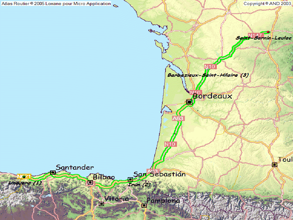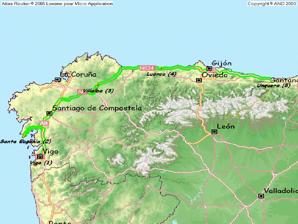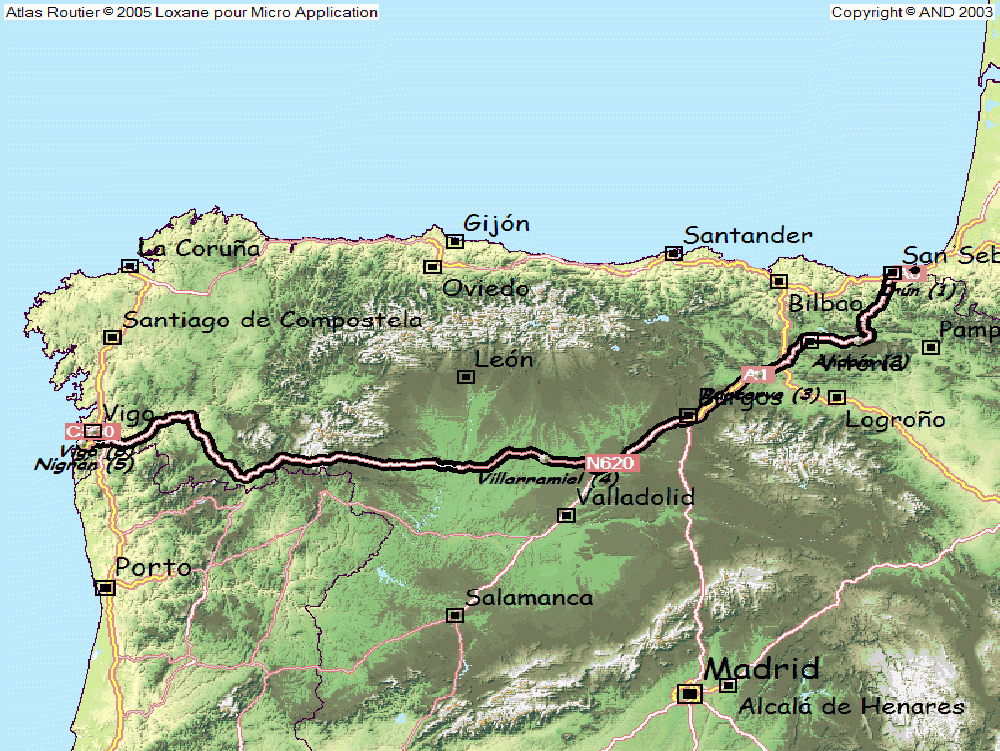 Un peu d’AP9 jusque St Jacques, puis la N634 via Villalba. Saint Jacques de Compostelle, on y aperçoit au loin la cathédrale. Mais on y voit surtout son Décathlon, son Kiabi.... C’est dingue le dépaysement que doivent ressentir les marcheurs après plusieurs centaines voire milliers de kms...