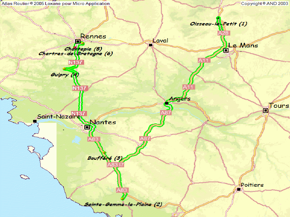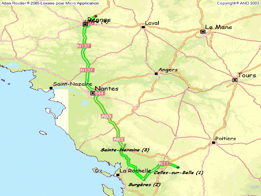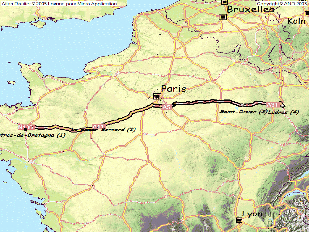 16h15 c’est chargé, les papiers, longs aussi, ils notent à la main la liste de toutes les balles, il y en a 112. Le boss qui s’occupe de ça voit que je suis vosgien et me parle des Vosges, qu’il avait plein de clients sur Gérardmer, Le Thillot .... Bref, c’était avant quoi. Je repars de là à 16h40, voilà, j’y ai passé encore 3h. Je n’en peux plus de ces journées de crotte. Me voilà parti pour le 85, vers Ste hermine. Je sonne Pascale car de là bas elle m’avait prévu du 85 pour le 35 en foulée, alors faut s’assurer des horaires encore. Pas de soucis, je peux vider tranquille dans le matin, je peux ne recharger qu’à 13h30.