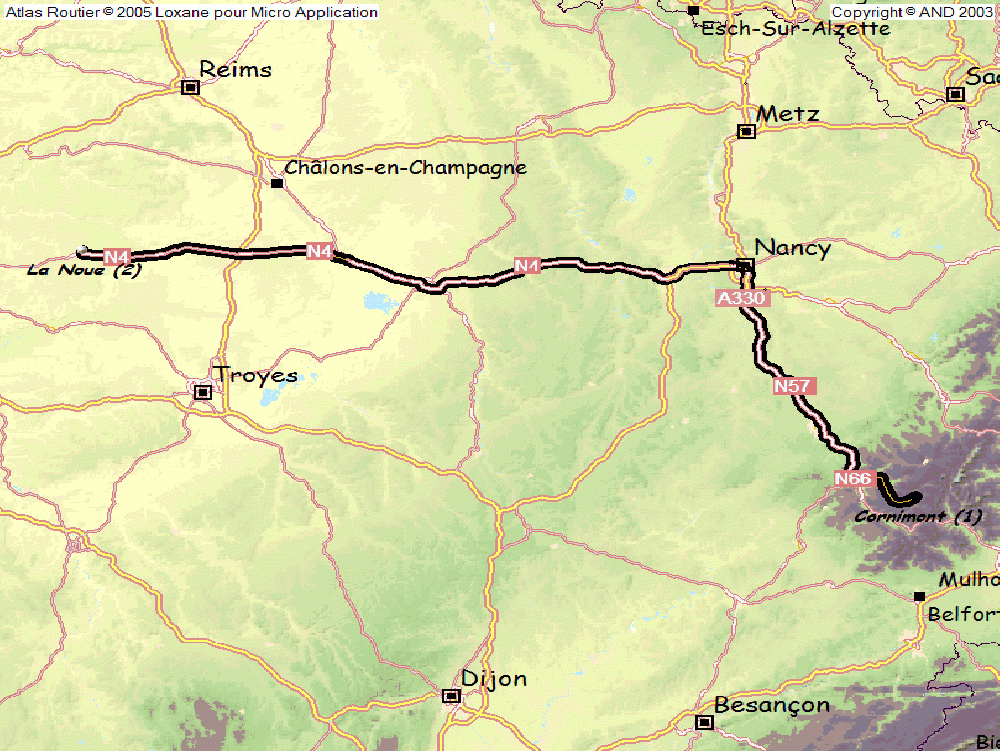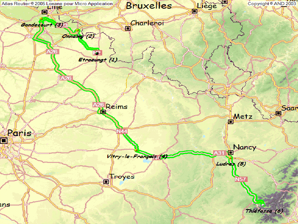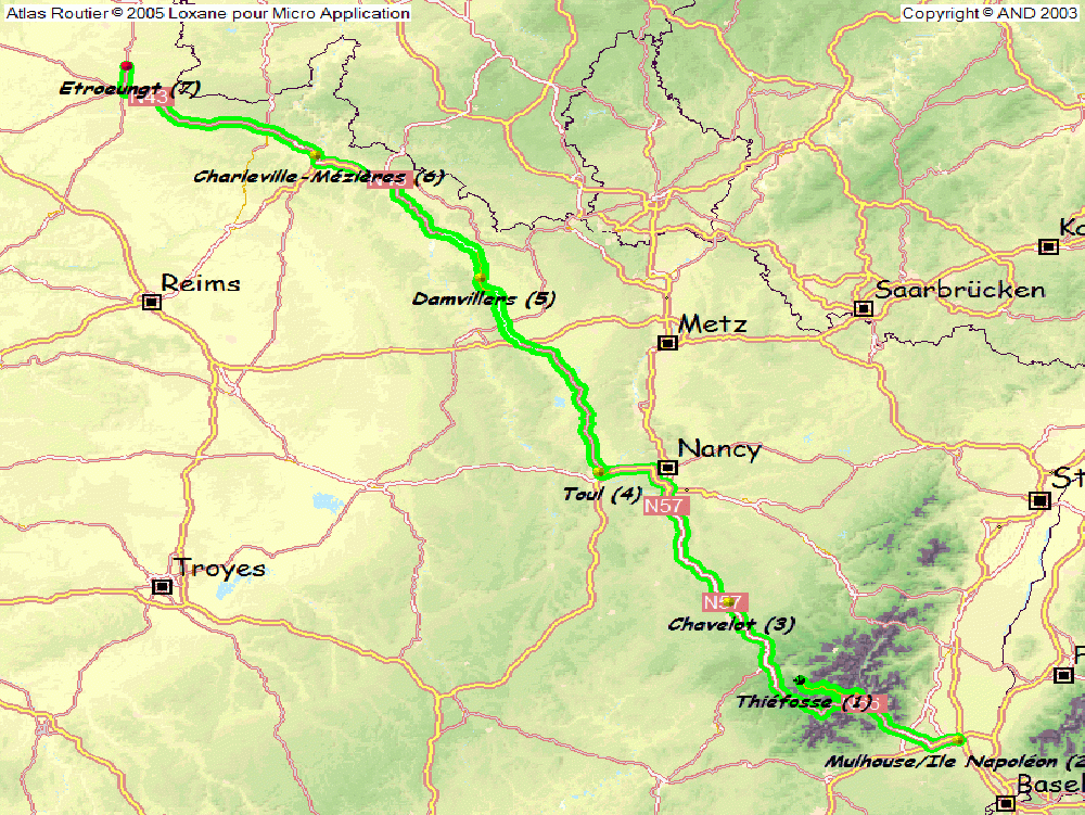 La route pour Charleville, y du choix, y a un an jour pour jour, je suis monté à Mouzon, j’étais passé par Toul, Etain, Damvillers, sur les conseils d’un copain ex alsace-champagne ardennes liner. Sinon, je passais aussi par Longwy, Longuyon Montmédy. Bon, je sais pas comment faire, je balance un message à un autre copain, Tibo, qui roule pour une boîte du 08 maintenant, il me dit pareil, par la Meuse.