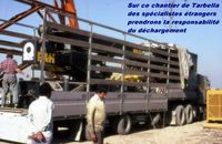 Un fameux tour sur le Pakistan que jamais je n'oublierai. Parti de Ulm en (D) avec une grue sur pneu très lourde, avec tous ses agregats câble etc, a destination du Barrage de Tarbela, température su l'autoroute Allemande moins 10 degrés, et pourtant arrivée à la douane de Spielfield (Allemagne Autriche) 3 pneus de ma remorque surbaissée avaient déjà rendus l'âme. Que faire, je ne bénéficiais plus que d'une roue de secours, mais j'avais rendez-vous à Zagreb avec Jacky de Fridericci, lui allait aussi au Pakistan. Tél. à la maison Fridericci pour leur faire part de mes pépins, ordre est donner de continuer mais de ne pas dépasser la vitesse de 40 km h, ce que je fis, mais peu avant Maribor : "pff" mon dernier pneu partait en fumée, surchauffe, malgré les consignes respectées scrupuleusement. Impossible de trouver des gommes de cette dimension alors une chose, découper dans les anciens pneus éclatés et mettre à l'intérieur un contrefort et continuer ainsi, Dieu merci sur mon véhicule j'avais un gonfleur. Peu après Maribor, j'établissais une liaison radio avec Jacky (il avait ressorti sa radio profondément camouflée car les (Youyous vous la séquestre quant il ne vous la détruise pas.) qui avait reçu ordre de m'attendre sur le parking de ZAGREB. Lentement entre 20 et 40 km h maximum, après un jour et une partie de la nuit, je rejoignais Zagreb ou fidèlement Jacky m'attendait dans sa douillette couchette. Je me devais de récupérer car mes heures de sommeils ont été bien courtes.