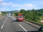 Gros dodo, je me suis bien réveillé dans la nuit, la force de l'habitude mais, je me suis rendormi et, c'est le réveil qui m'a fait bondir dans la couchette. Au bar, je lis le journal en prenant mon café, l'accident d'hier a fait deux morts et un blessé grave. Un encart donne un avis du préfet qui prend la défense du chauffeur et signale que les poids lourds ne sont pas la cause principales des accidents, pour une fois qu'un officiel ne nous tape pas dessus, il faut quand même le signaler. Chargement à côté, et, si je ne suis pas le premier, je suis quand même bien placé pour partir de bonne heure. Début de matinée, je suis sorti et, la journée est presque terminée, il ne me reste plus qu'à rentrer, une formalité si les touristes veulent bien me laisser un peu de bitume. Ca commence bien, l'A75 est barrée à Lodève mais, l'A9 vient d'être ré ouverte parce que, si j'ai bien compris, ça a encore tapé ce matin. Jusqu'à Nîmes, pas trop de monde, je m'autorise un peu de nationale, jusqu'à Montélimar ou je mange avec un copain et, vu l'heure, je vais pouvoir passer à l'atelier faire remplacer mon pare choc cassé. Je vais enfin pouvoir faire des photos du côté gauche de mon camion.